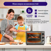 сигнал об окончании приготовления, дверца из закаленного стекла, световой индикатор работы; ручка для вертела в комплекте; количество противней в комплекте: 1