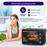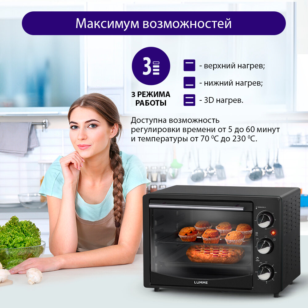 сигнал об окончании приготовления, автоматическое выключение, дверца из закаленного стекла, световой индикатор работы; количество противней в комплекте: 1