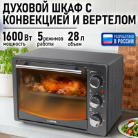 сигнал об окончании приготовления, дверца из закаленного стекла, световой индикатор работы; ручка для вертела в комплекте; количество противней в комплекте: 1