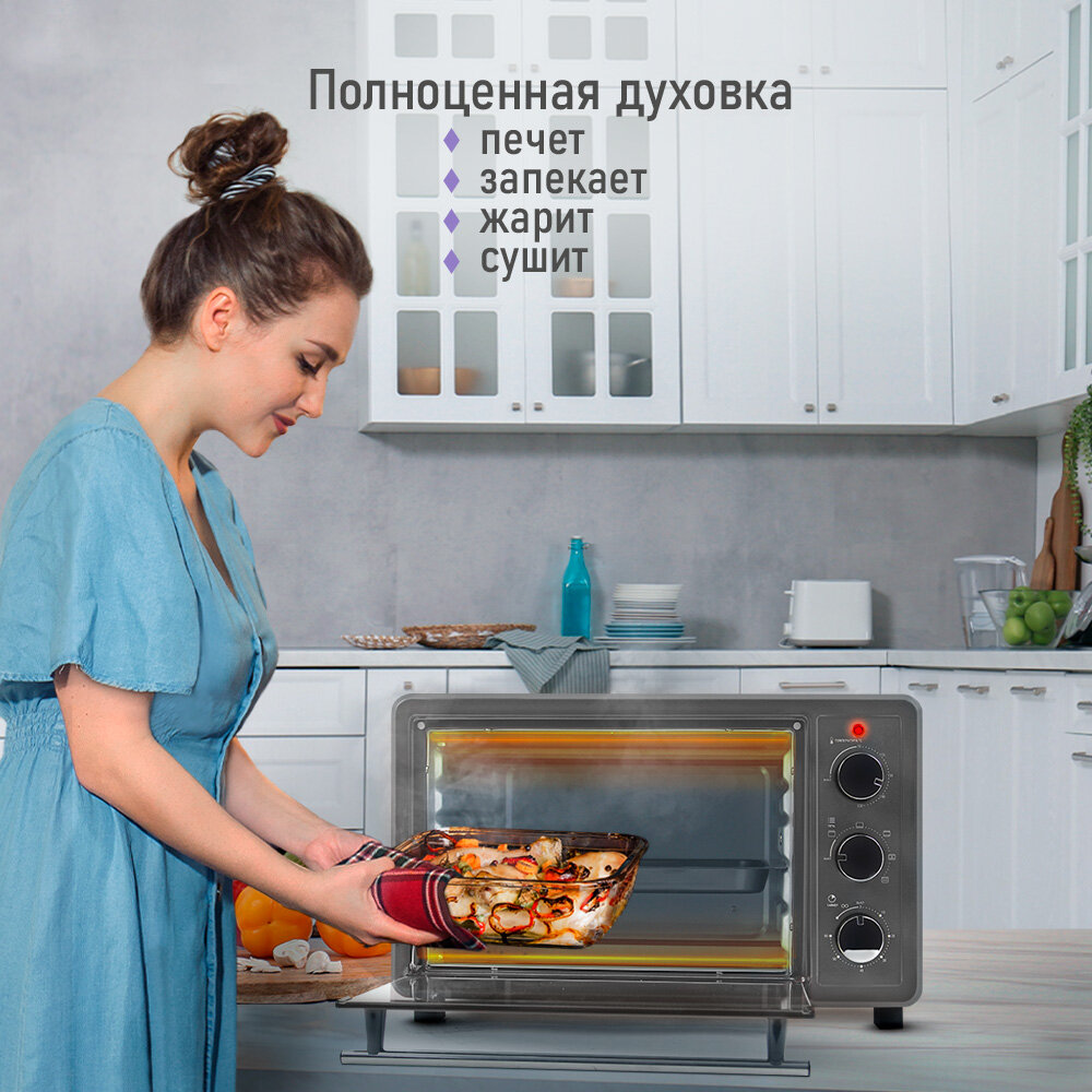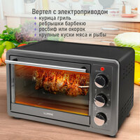 Режим конвекции избавляет от необходимости перемещения блюда и противня во время приготовления, так как обеспечивает постоянную циркуляцию горячего воздуха по всей внутренней камере, за счет чего достигается одинаковая температура нагрева блюда со всех сторон, что позволяет пище запекаться и покрываться румяной корочкой равномерно по всей поверхности. Вертел с электроприводом обеспечит особенно аппетитное запекание целой курицы, больших кусков мяса, рыбы и овощей-гриль. За счет автоматического плавного вращения блюда запекаются равномерно со всех сторон, приобретая красивую хрустящую корочку и особый вкус. Мясо получается очень сочным и при этом менее жирным, а потому полезным, так как при приготовлении на вертеле жир стекает, а сок «запечатывается» и сохраняется внутри блюда. Электродуховка, духовка для дачи, компактная духовка