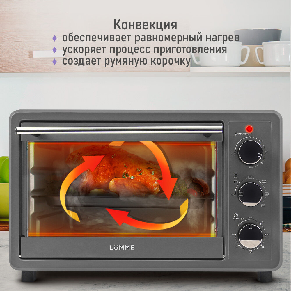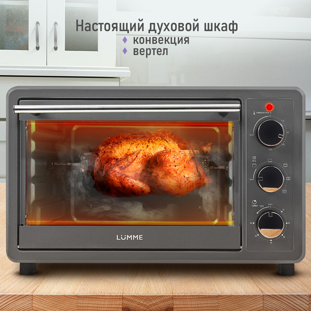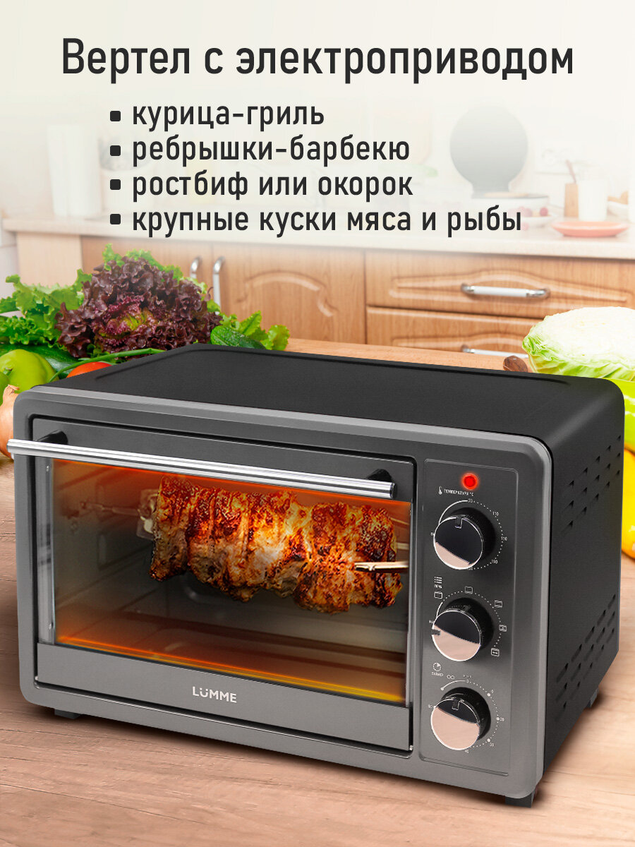 Мощность: 1800 Вт, Объем: 30 л, Конвекция, Вертел, 4 нагревательных элемента,5 режимов работы,Регулировка температуры: 70°C - 230°C, таймер до 60 мин., Сигнал об окончании приготовления, Световой индикатор,Аксессуары в комплекте: вертел, решетка, противень с антипригарным покрытием, ручка для извлечения противня/решетки, поддон для сбора крошек, ручка для вертел. Четыре мощных нагревательных элемента быстро прогревают большую камеру, поэтому электрический духовой шкаф LUMME поможет Вам приготовить самые вкусные горячие блюда, чудесную домашнюю выпечку с румяной корочкой и бесчисленное множество разнообразных кулинарных шедевров без потери времени. Вы сможете выбирать способ приготовления, располагая противень и решетку на любом из трех уровней и включая один из трёх режимов нагрева (верхний, нижний, верхний + нижний).
