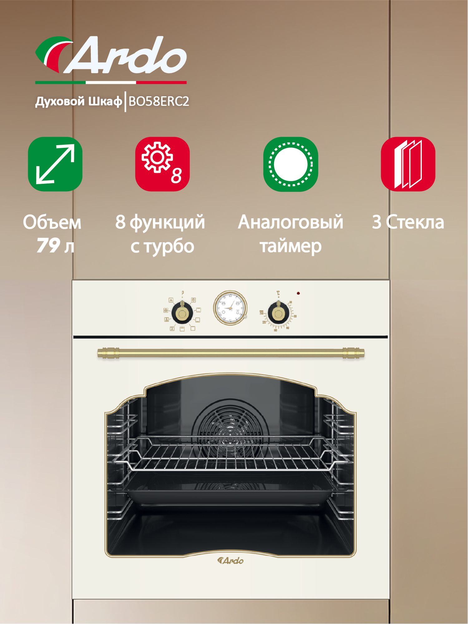 Купить Духовой электрический шкаф Ardo BO58ERC2 с грилем и конвекцией, 76 л, 9 режимов, тройное остекление дверцы, съемные стекла, 60 см с доставкой по всей России.
