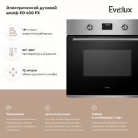 Купить Электрический духовой шкаф Evelux EO 630 PX ширина 60 см, объем 70 л, гриль, конвекция, 8 режимов, нержавеющая сталь с доставкой по всей России.