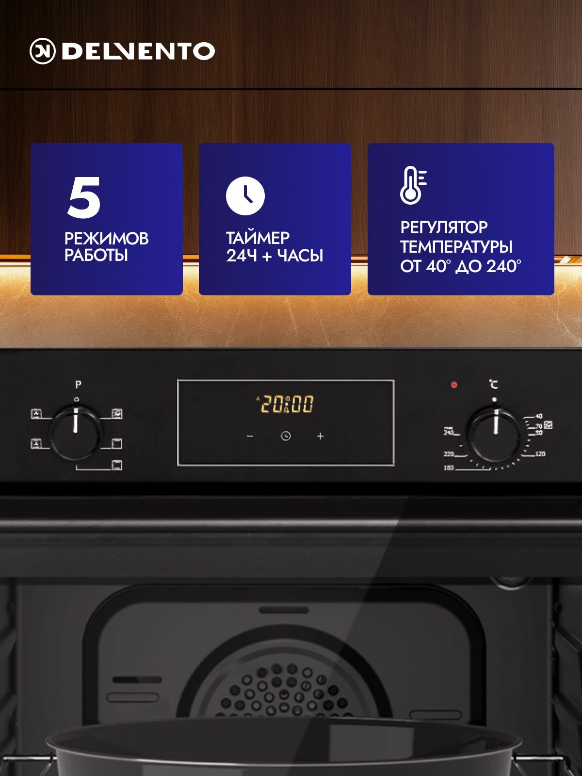 Духовой шкаф электрический встраиваемый DELVENTO 60см, конвекция, 5 режимов, 58л, 2 стекла, таймер, 3 года гарантии