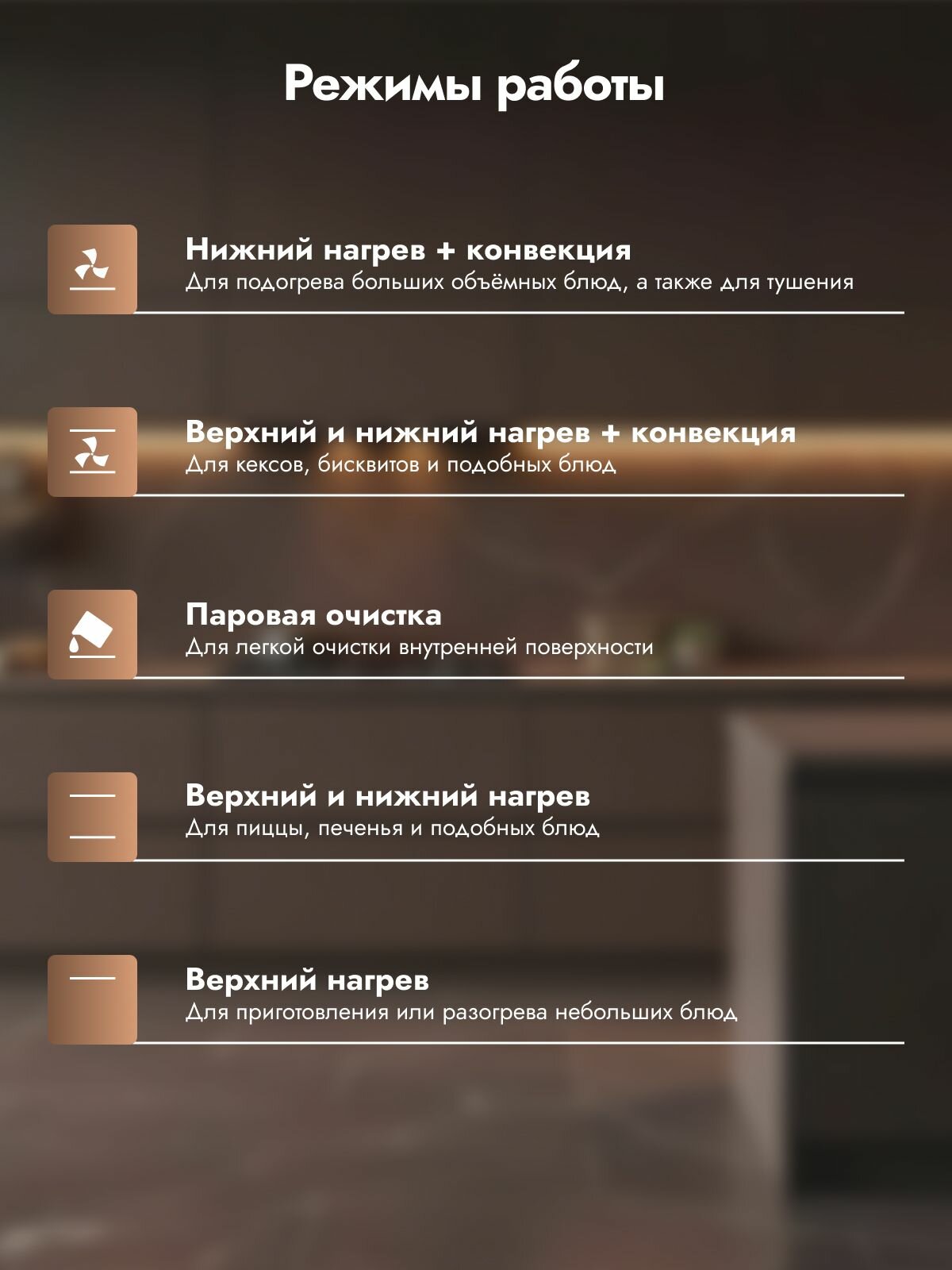 большой гриль, верхний нагрев, верхний нагрев + конвекция, верхний нагрев + нижний нагрев, верхний нагрев + нижний нагрев + конвекция, гриль, гриль + конвекция, конвекция, нижний нагрев, нижний нагрев + конвекция