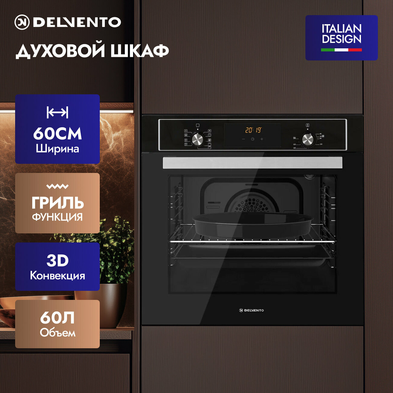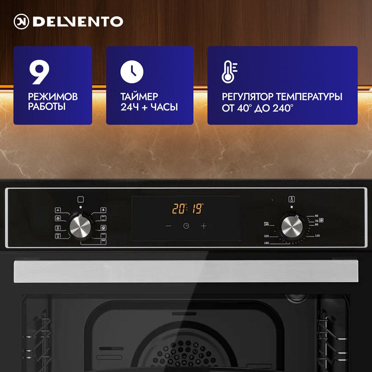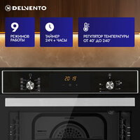 Купить Духовой шкаф электрический встраиваемый 60см черный / 9 режимов (гриль + конвекция) / DELVENTO V6EB59001 / дисплей / таймер 90 мин, часы / двойное стекло LOW-E / хром. решетка и 2 противня: стандартный + круглый / подсветка / гарантия 3 года / с доставкой по всей России.
