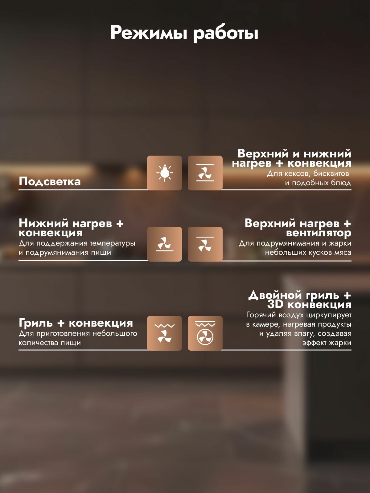 | Режимы | большой гриль, верхний нагрев, верхний нагрев + конвекция, верхний нагрев + нижний нагрев, верхний нагрев + нижний нагрев + конвекция, гриль, гриль + конвекция, конвекция, нижний нагрев, нижний нагрев + конвекция |