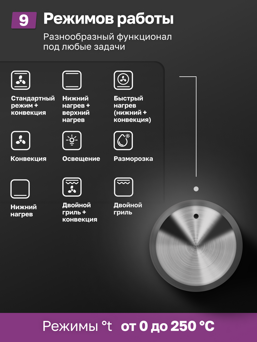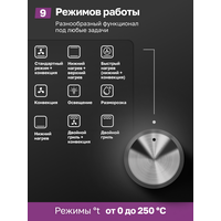 - Количество программ: 9, включая разморозку, нижний нагрев, двойной гриль и конвекцию.