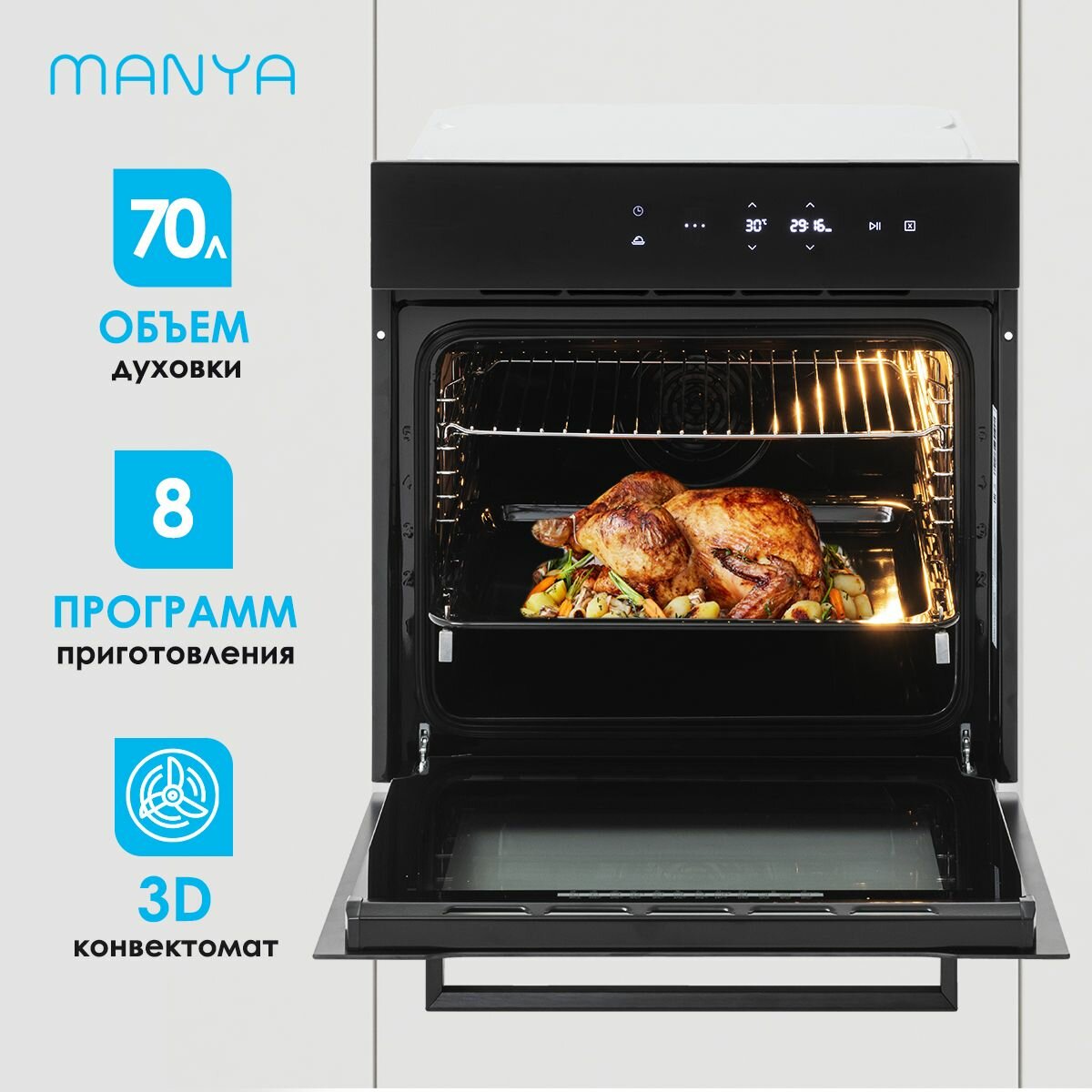Духовой шкаф электрический встраиваемый MANYA BO639BG черный, объем 70 л, 8 программ, сенсорное управление, конвекция гриль, каталитическая очистка, 3 стекла: сравнение цен, характеристики, фото, актуальное наличие и цены.