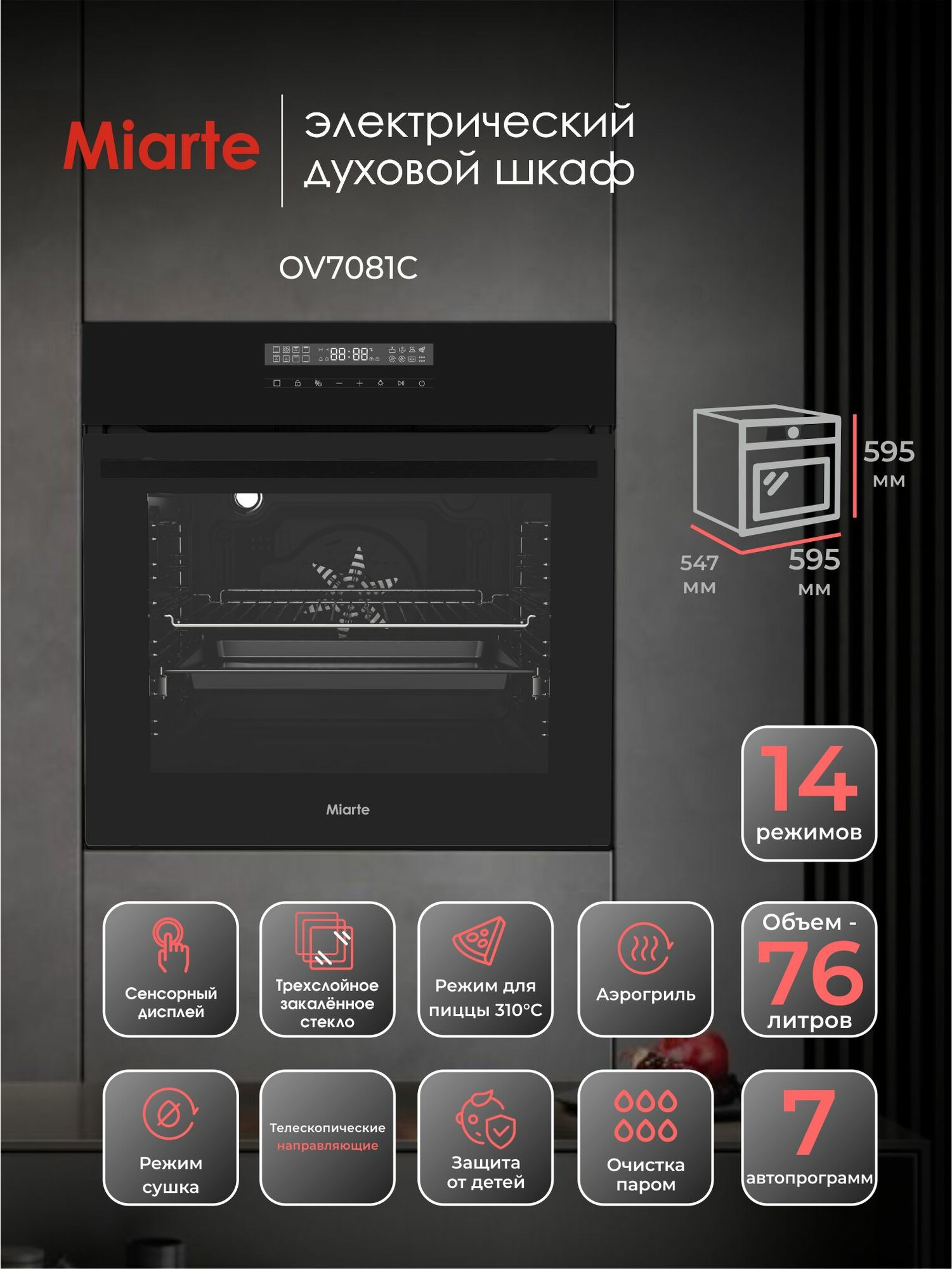 Духовой шкаф электрический встраиваемый Miarte OV7081C, 76 литров
