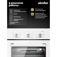 | Режимы | верхний нагрев, верхний нагрев + конвекция, верхний нагрев + нижний нагрев, верхний нагрев + нижний нагрев + конвекция, гриль, гриль + конвекция, конвекция, нижний нагрев, нижний нагрев + конвекция |