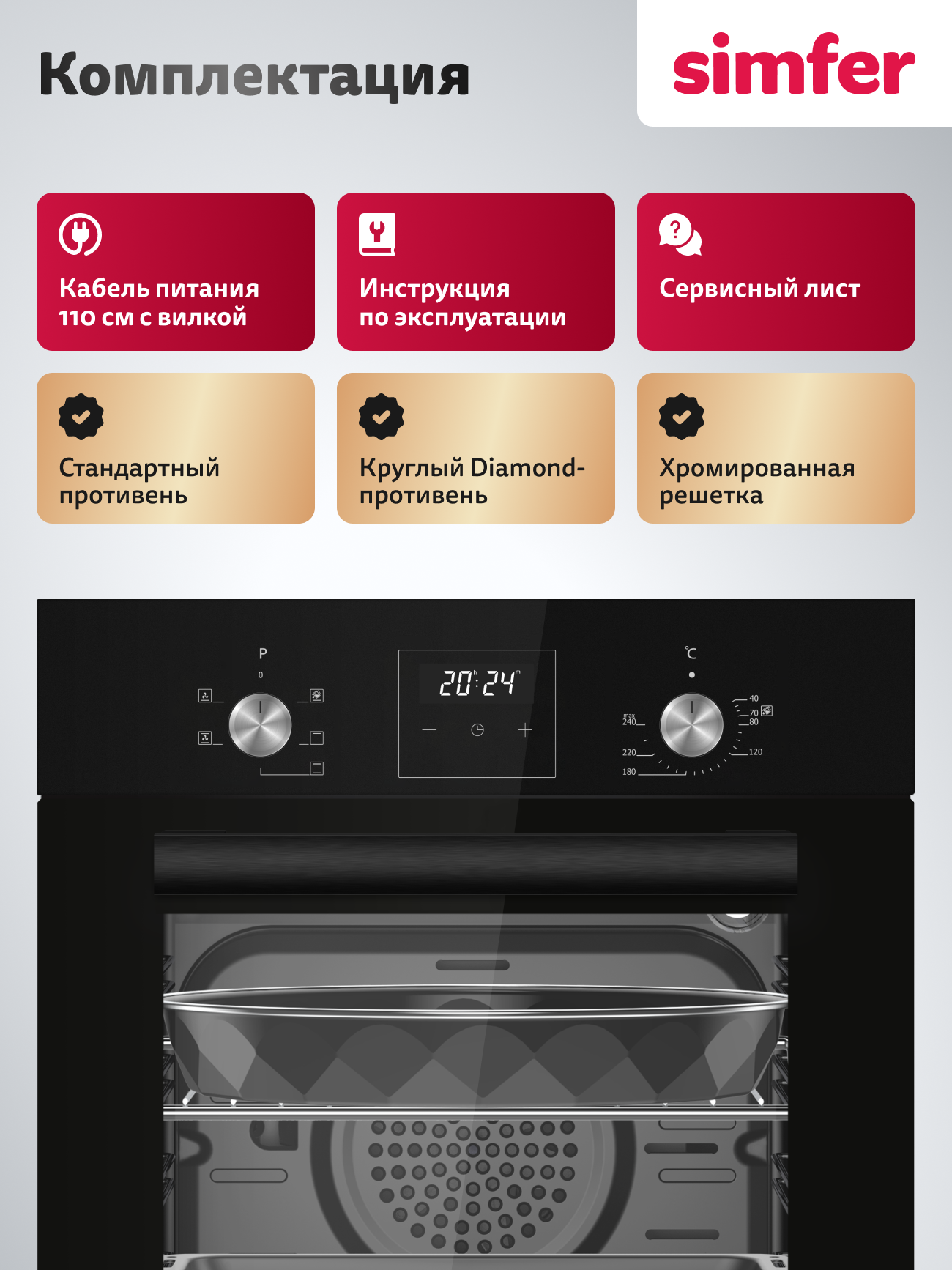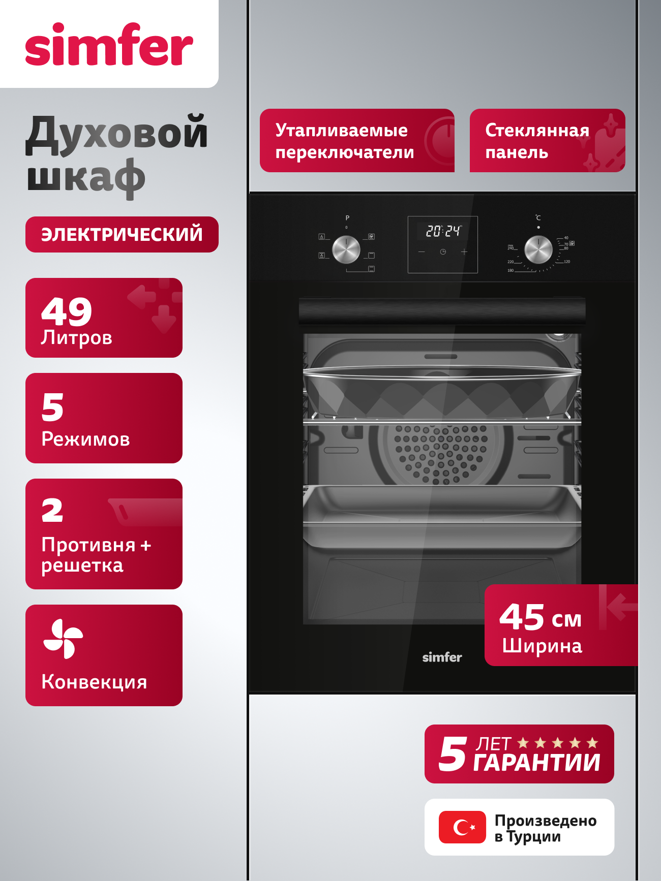 Духовой шкаф электрический встраиваемый Simfer 45см, 5режимов, 49л, конвекция, Push Pull, таймер, 5 ЛЕТ гарантия, турция: сравнение цен, характеристики, фото, актуальное наличие и цены.