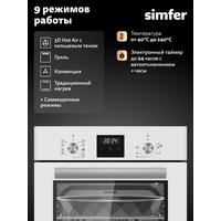 | Режимы | верхний нагрев, верхний нагрев + конвекция, верхний нагрев + нижний нагрев, верхний нагрев + нижний нагрев + конвекция, гриль, гриль + конвекция, конвекция, нижний нагрев, нижний нагрев + конвекция |