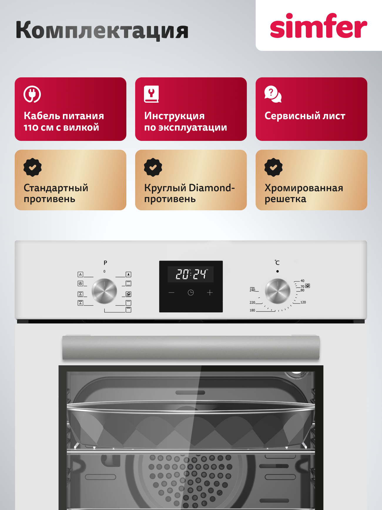 | Подробная комплектация | стандартный и круглый противень с антипригарным покрытием, хромированная решетка, хромированные направляющие, инструкция |