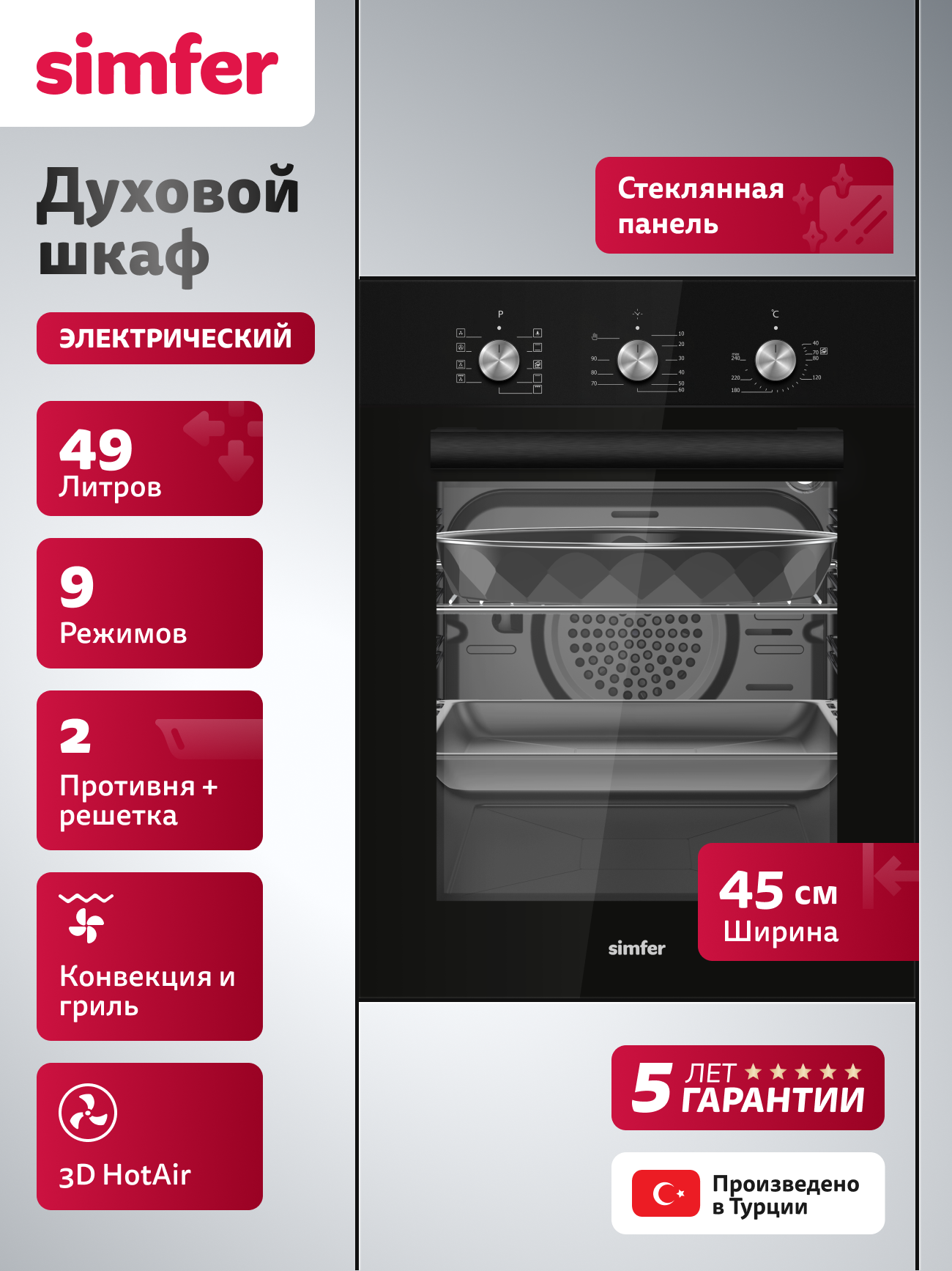 Духовой шкаф электрический встраиваемый Simfer 45см, 9 режимов, гриль, 3D конвекция, таймер, 2 противня, 5 ЛЕТ гарантия: сравнение цен, характеристики, фото, актуальное наличие и цены.