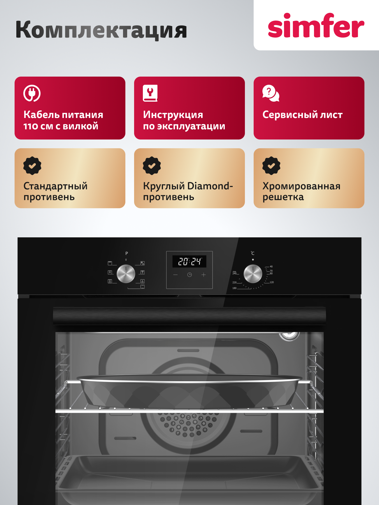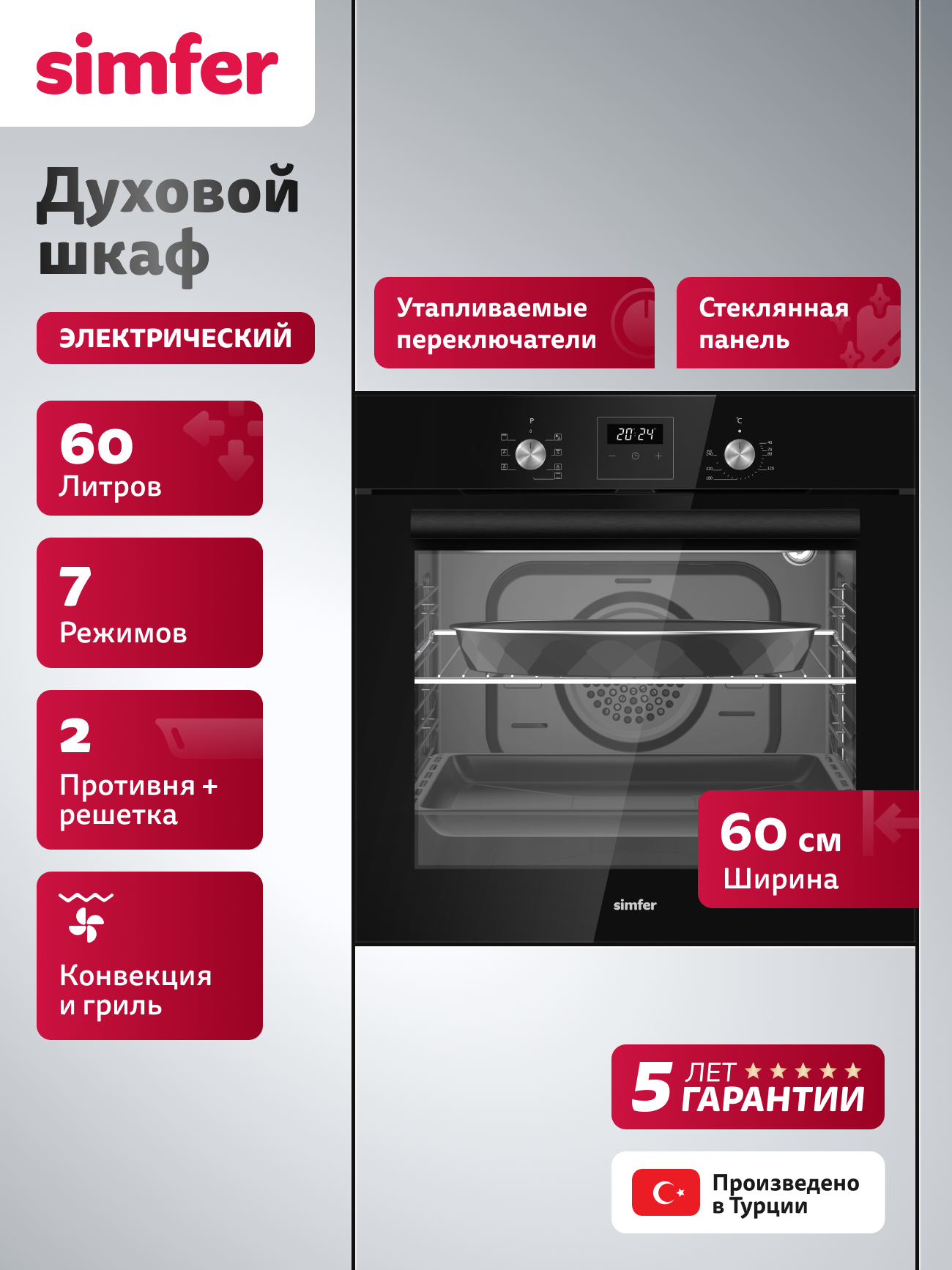 Духовой шкаф электрический встраиваемый Simfer 60см, 7 режимов, 60л, гриль, конвекция, Push Pull, таймер, 5 ЛЕТ гарантия: сравнение цен, характеристики, фото, актуальное наличие и цены.