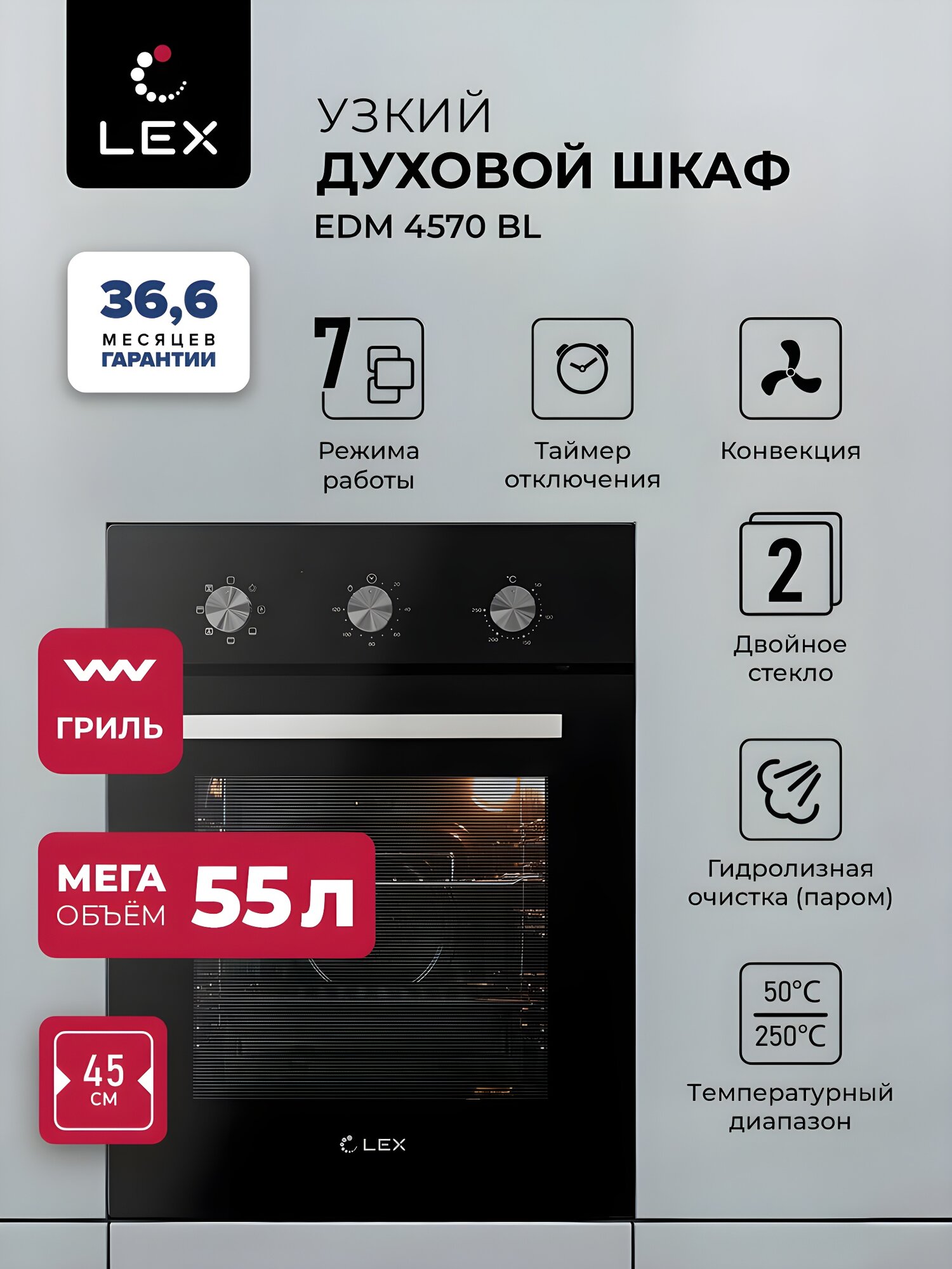 Духовой шкаф LEX EDM4570BBL электрический черный 55 л 7 режимов гриль конвекция 45.5x58x59.5 см: сравнение цен, характеристики, фото, актуальное наличие и цены.