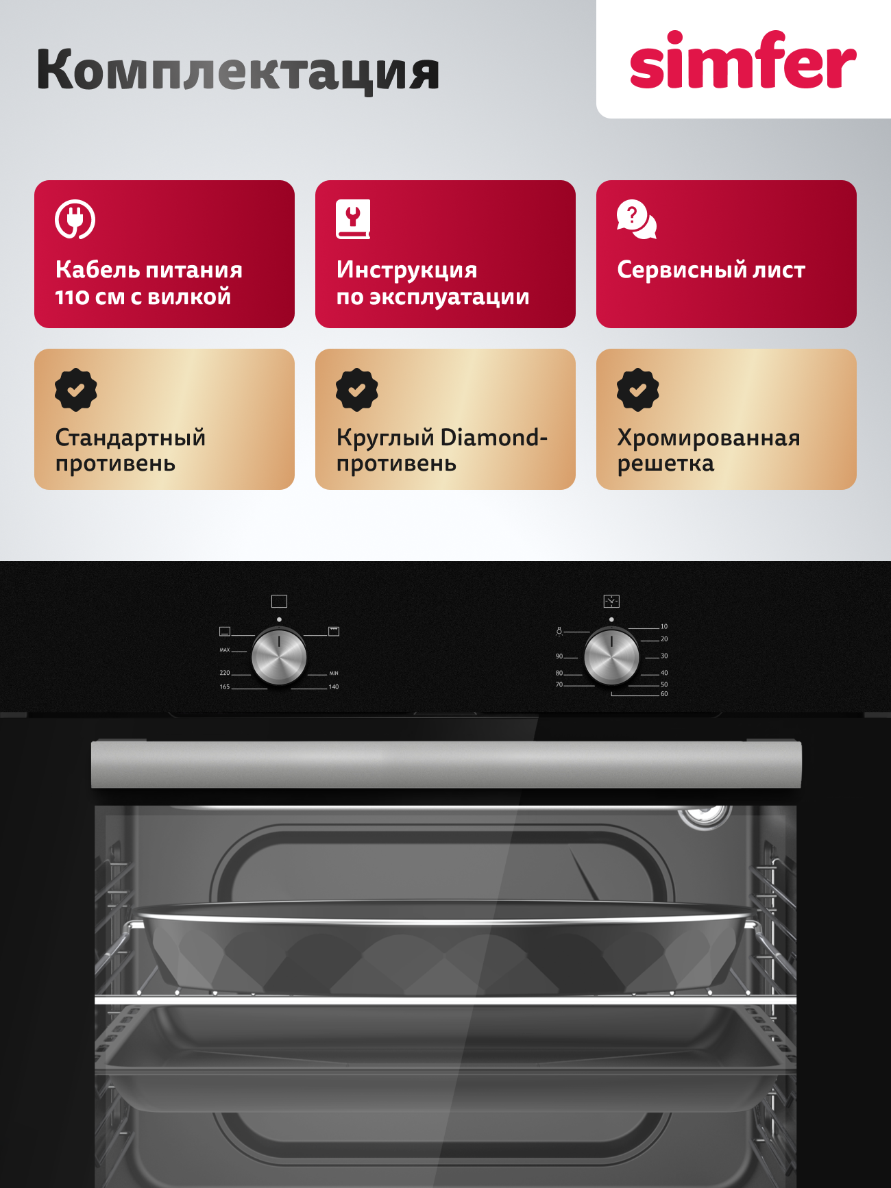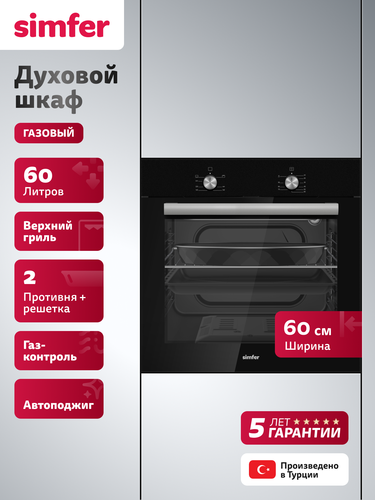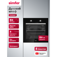 Купить Духовой шкаф Simfer газовый встраиваемый 60см, гриль, газ-контроль, 60л, 2 стекла, таймер, 5 ЛЕТ гарантия. Турция с доставкой по всей России.