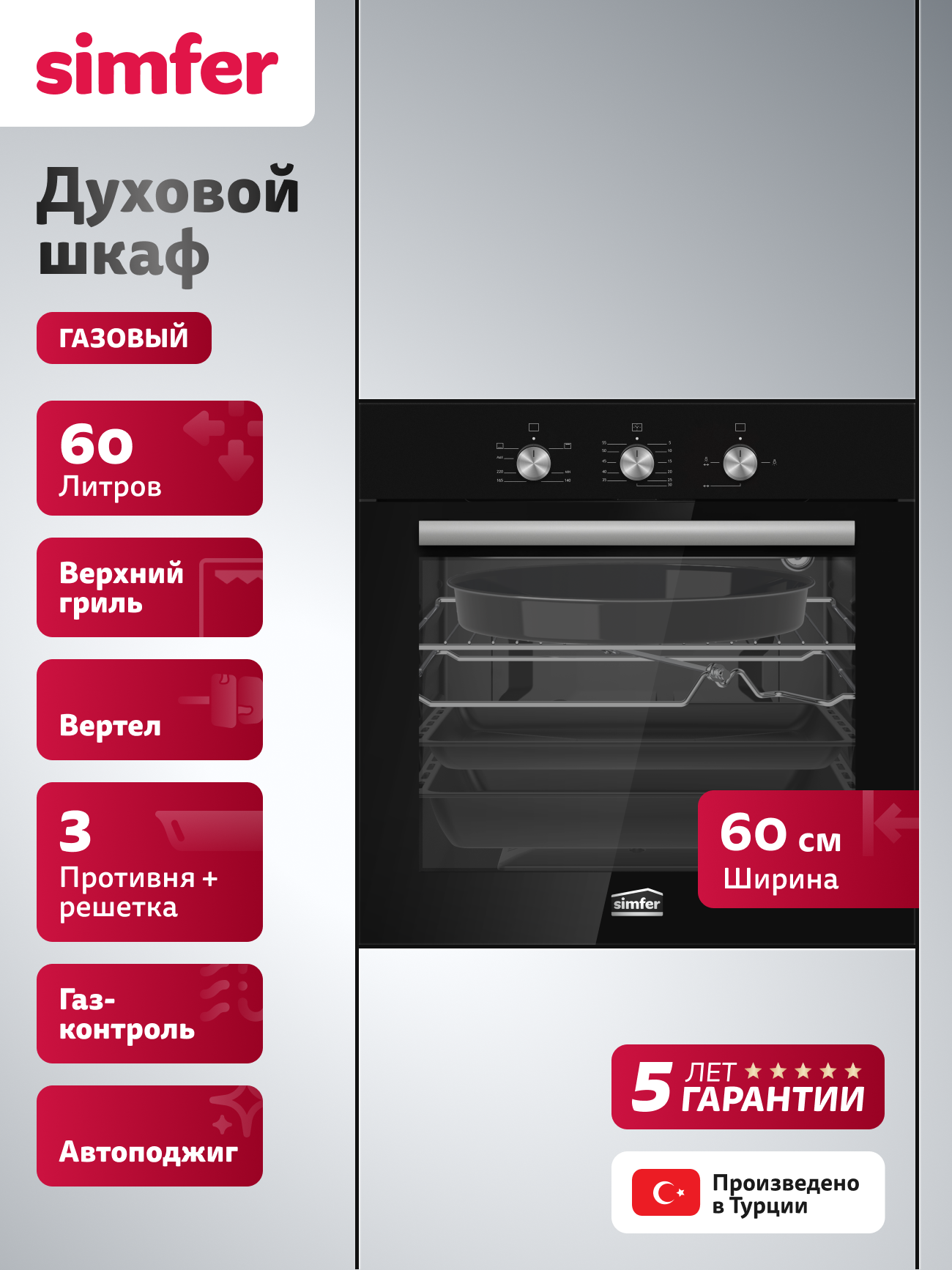 Купить Духовой шкаф встраиваемый газовый Simfer 60см, гриль, 60л, газ-контроль, вертел, автоподжиг, таймер, 5 ЛЕТ гарантия с доставкой по всей России.