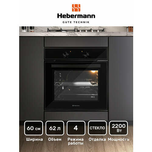 Духовой шкаф электрический встраиваемый Hebermann HBBO 6004.1 B, черный, верхний и нижний нагрев, двойное стекло у дверцы, 4 режима работы, объем духовки 62 л, отделка фасада-стекло.: сравнение цен, характеристики, фото, актуальное наличие и цены.