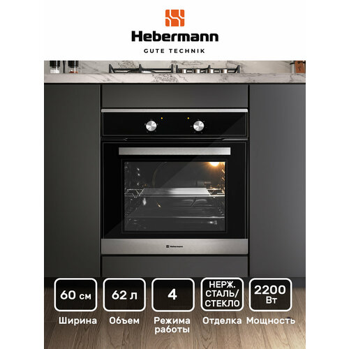 Духовой шкаф электрический встраиваемый Hebermann HBBO 6004.1 X, 1 решетка и 1 противень, двойное стекло у дверцы, 4 режима работы, объем духовки 62 л, отделка фасада-стекло+нержавеющая сталь.: сравнение цен, характеристики, фото, актуальное наличие и цены.