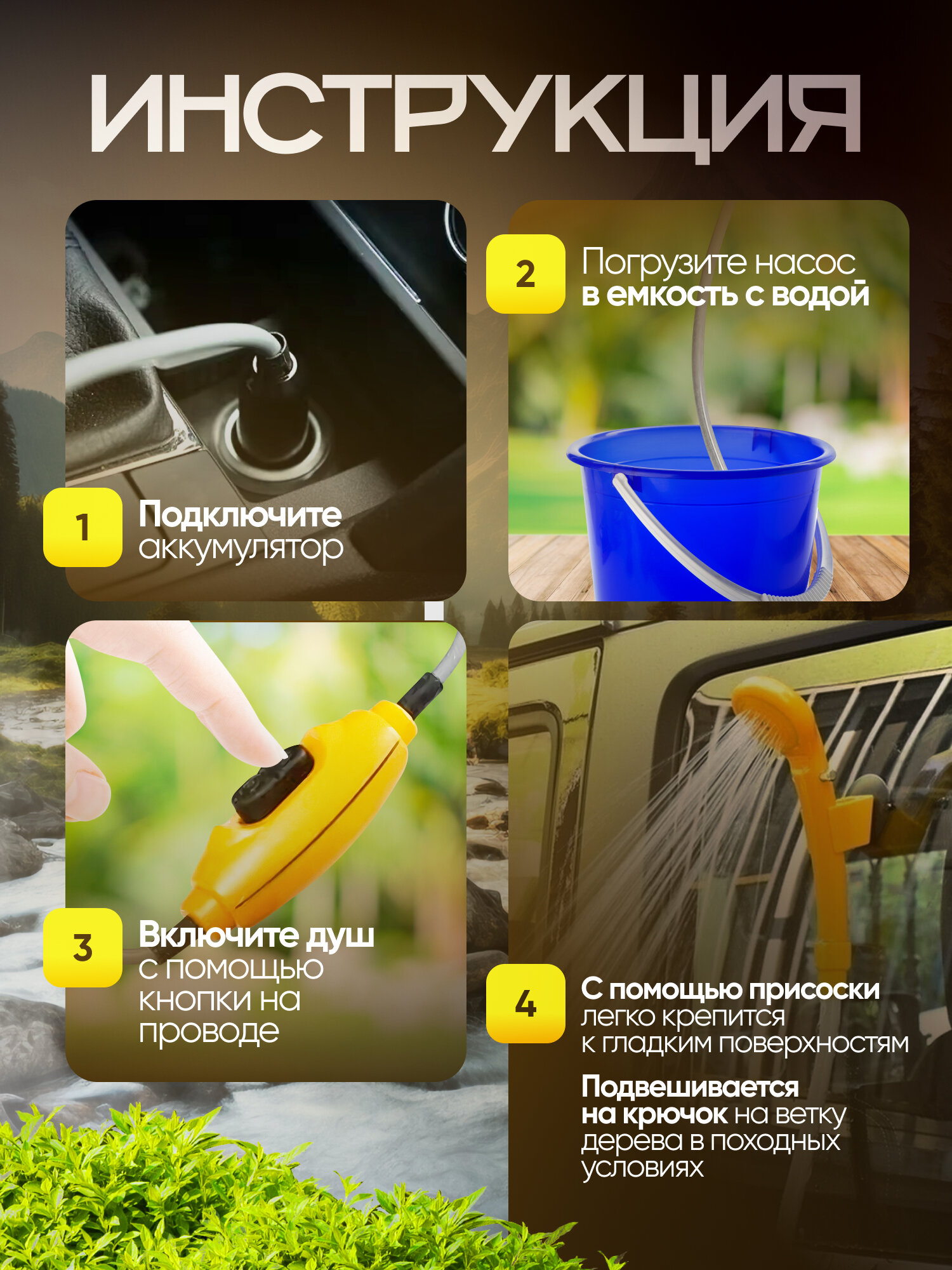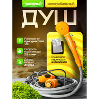 Душ автомобильный походный от прикуривателя Aloon 12В оснащен двухметровым шлангом. Душ от прикуривателя подходит для мытья автомобиля, овощей, животных, полива растений. Он обеспечивает мощный поток воды со скоростью 2,5 л/мин. Подключается к прикуривателю через четырехметровый провод. Походный душ удобен в хранении благодаря разборной конструкции. В наборе есть мешок для хранения, насос, крюк для подвешивания и другие элементы фиксации и применения. Душевая лейка выдерживает воздействие воды с температурой не выше 60 градусов. После каждого использования необходимо сливать остатки воды.