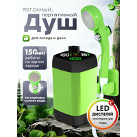 Душ походный аккумуляторный. В комплекте: насос, душевая лейка, шланг, держатель с набором креплений трех видов, сумочка и инструкция на русском языке. Универсальность использования автономного уличного душа позволяет применять его летом для дачи и сада, туристами в походе, на кемпинге, пикнике, отдыхе на природе в летний день, для мытья автомобиля, полива садовых цветов и огорода, использовать в кабине походной мобильной бани и туалета, как умывальник, для купания домашних питомцев на улице. Встроенный аккумулятор емкостью 6000мАч обеспечивает непрерывную работу туристического дорожного душа в течение 150 минут. Дачный мини душ может прослужить до 7 дней без подзарядки. Быстро заряжается от любого USB разъема, в том числе от прикуривателя авто. На USB разъеме - водонепроницаемая заглушка. Легкий и компактный дизайн делает портативный переносной душ идеальным для путешествий и кемпингового туризма. Электрический поливочный мини-душ с аксессуарами уместится в любой багаж и станет незаменимым спутником в дороге и автомобильном путешествии. Мощная лейка с насосом перекачивает воду до 8 л/мин, работает тихо. Качает воду из ведра на уровне 1 см. Интеллектуальный трехцветный индикатор температуры воды всегда держит вас в курсе измерения. Цветовая индикация на кнопке включения показывает уровень заряда батареи. Напор воды плавно регулируется с помощью кнопки, расположенной на душевой лейке. Также есть функция временной остановки подачи воды до 30 секунд, не прибегая к отключению насоса. Встроенный фильтр многократного использования гарантирует чистоту и удовольствие от принятия душа. Качественный противоударный ABS пластик обеспечивает долгий срок службы, а шланг оптимальной длины 2 метра создает комфорт и свободу движения. Набор предусматривает три варианта крепления держателя для разных условий и ситуаций. Не откладывайте свой комфорт на потом! Путешествия и отдых на даче с нашим полевым душем оставят в вашей памяти только самые яркие и приятные воспоминания.