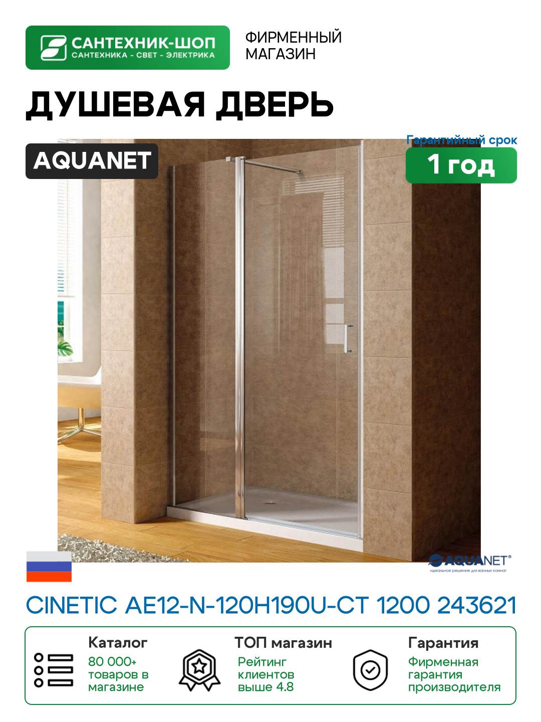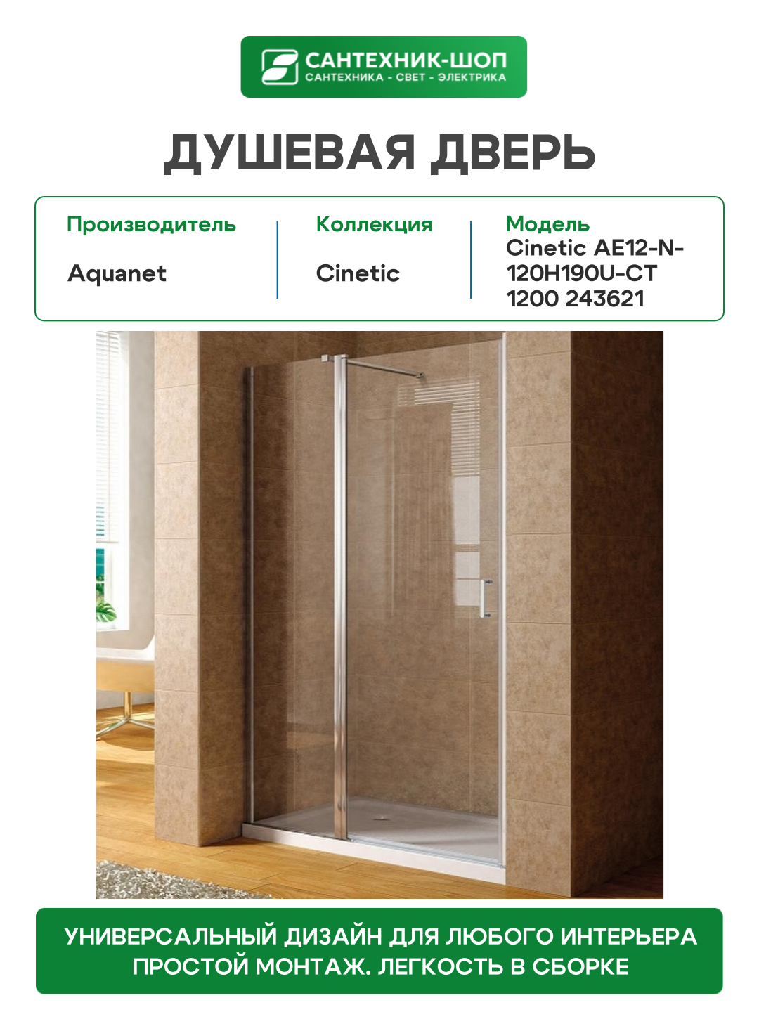 Душевая дверь Aquanet Cinetic AE12-N-120H190U-CT 1200 243621 профиль Хром стекло прозрачное: сравнение цен, характеристики, фото, актуальное наличие и цены.