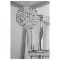 Душевая кабина Esbano ES-118CKR прямоугольная со стеклянной крышей. Универсальная (сборка в правом или левом исполнении). Низкий поддон, сифон с гидрозатвором, двойные ролики, большое овальное зеркало с фацетом (69х38 см), 3-х режимная душевая лейка на стойке, мыльница, стеклянная полочка (65 см) с отверстием под стакан и ограничителем, стеклянный стакан, верхний душ с прорезиненными соплами, вентиляционное отверстие.
