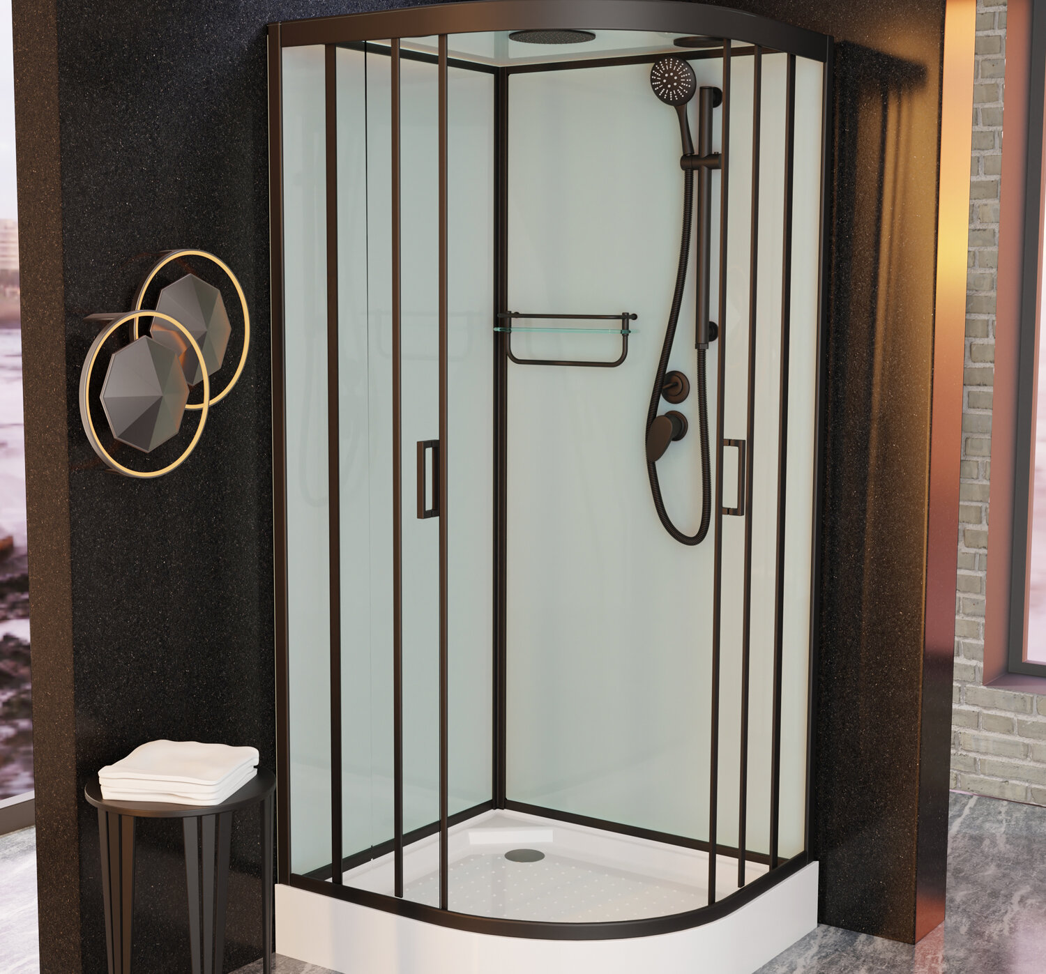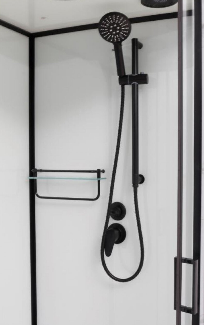 душевая лейка, зеркало, поддон, полки, сиденье