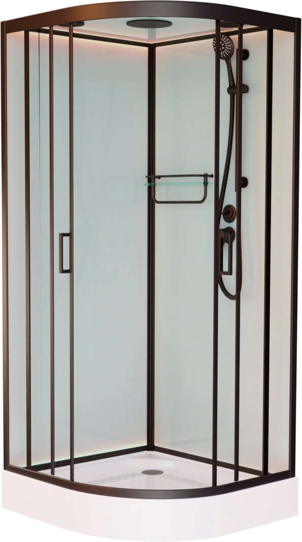 материал профилей: полированная сталь (полированный хром), колба сифона: ширина 90 мм (с ловушкой для волос и гидрозатвором), закалённые стёкла, безсиликоновая сборка, резьбовые соединения смесителя с душем, верхний душ (с резиновыми соплами от известков