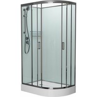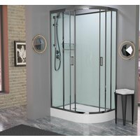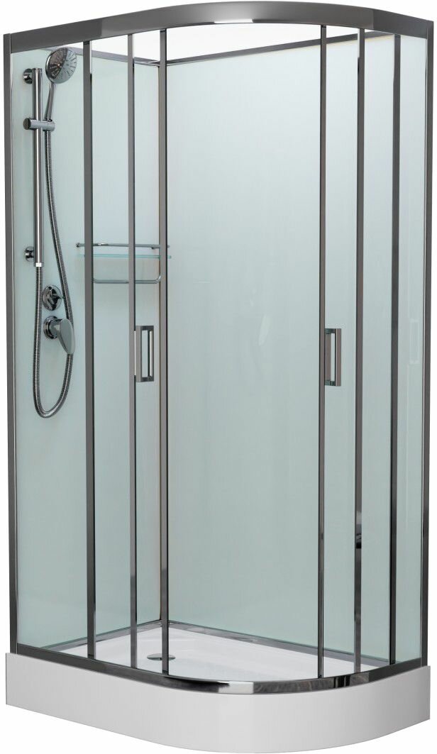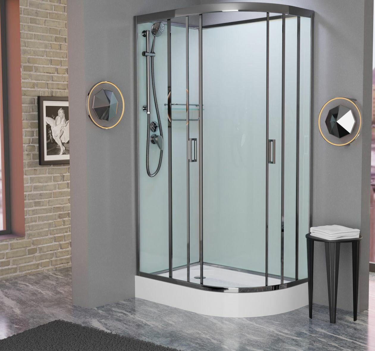 материал профилей: полированная сталь (полированный хром), колба сифона: ширина 90 мм (с ловушкой для волос и гидрозатвором), закалённые стёкла, безсиликоновая сборка, резьбовые соединения смесителя с душем, верхний душ (с резиновыми соплами от известков
