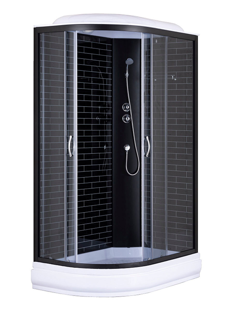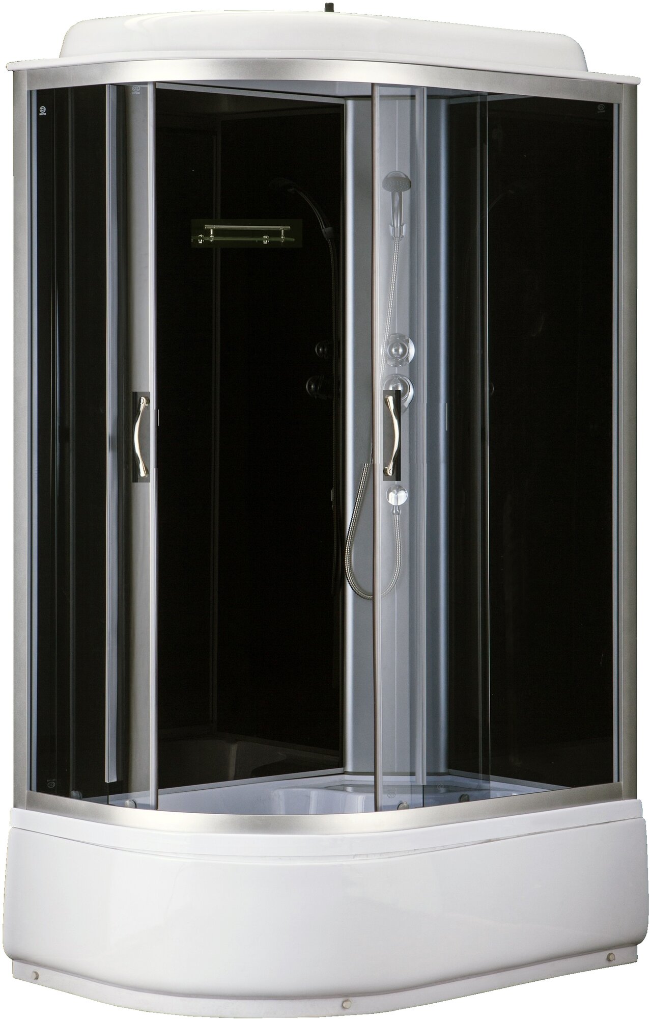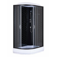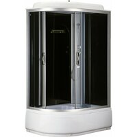 Условный размер, мм: 1200x800х2150 Конструкция дверей: 2 раздвижные двери Материал полотна дверей: тонированное стекло 4 мм Материал профиля: алюминий Материал задних стенок: черное стекло Исполнение: правостороннее Оснащение: смеситель, верхний (тропический) душ, ручная лейка, полка, встроенное на поддоне сиденье, поддон из АБС-пластика 400 мм с антискользящим покрытием на металлическом каркасе с регулируемыми по высоте ножками, сифон с гидрозатвором