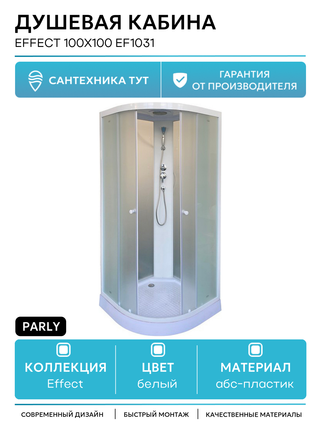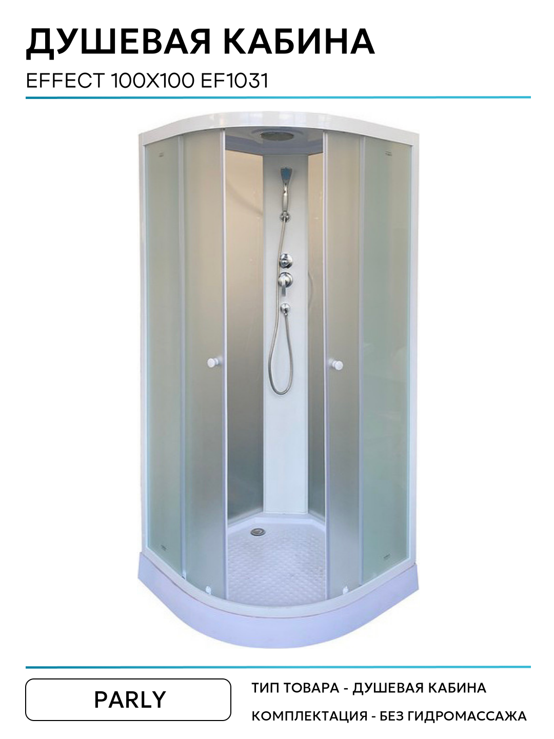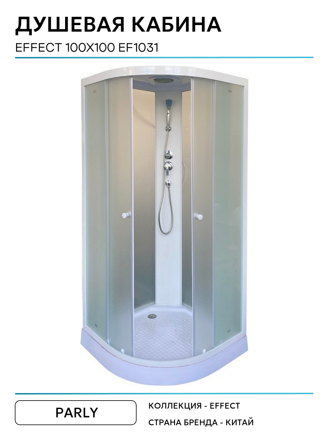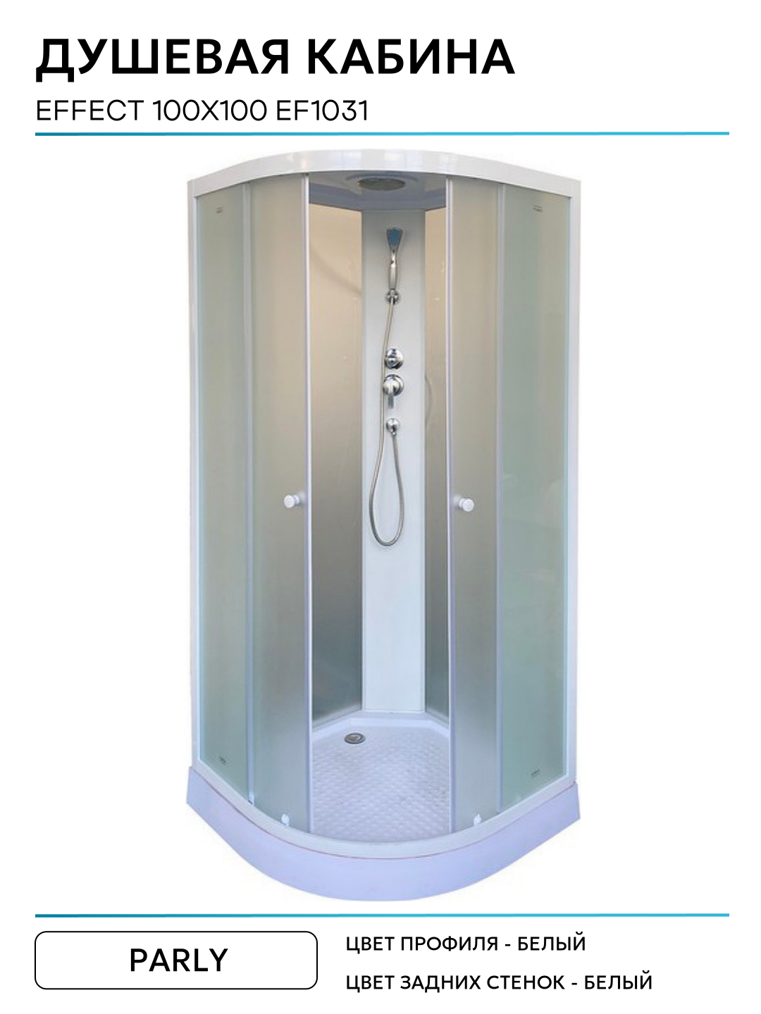 В современном мире актуален тренд на рациональность и практичность. При тотальном дефиците времени, многие люди не могут себе позволить полежать в теплой ванне. В этом случае душевые кабины являются лучшим функциональным решением для ванных комнат. Душевые кабины бренда Parly изготовлены из высококачественных материалов с учетом современных дизайнерских тенденций и являются отличной альтернативой классическим ванным. Преимущества душевых кабин Parly: Экономия воды. Учёные подсчитали, что в душе человек расходует на принятие водных процедур в 2 раза меньше воды, чем при приёме ванны. То есть выбор в пользу душевой кабины, позволит сократить траты при оплате водоснабжения приблизительно в 1,5 раза. Компактность. Одним из главных достоинств душевых кабин является то, что их установка может значительно сэкономить пространство в санузле. Если площадь вашей ванной комнаты меньше 3 м², покупка кабины — единственное верное решение. Безопасность. Дно поддона обладает противоскользящим эффектом, движения внутри свободны и ничем не ограничены, также есть возможность выбора высоты поддона. Комфорт. Наличие в крыше вентиляционных отверстий, закрытых дефлекторами, при необходимости позволит снизить влажность, путем подключения к вентиляционной системе. Удобство уборки. Створки кабины закрываются плотно, вода не попадает на пол и другие поверхности, находящиеся в непосредственной близости. Все части, необходимые для проведения влажной уборки, доступны. Современный дизайн. Модельный ряд кабин Parly представлен в различных стилях, конфигурациях и цветах, а также с различными формами поддонов. Поэтому можно индивидуально подобрать кабину практически для любого дизайнерского решения. Презентабельный вид кабинам придают закаленные стекла, которые способствуют надежности и не боятся химических средств, что позволяет дольше сохранить их внешнюю привлекательность. Душевая кабина EF1031 бренда PARLY. Размер: 100х100x210 см. Достоинства: Поддон, крыша белые из ABS-пластика, 10см. Профиль - белый алюминиевый. Центральная панель — пластиковая. Передние стекла — закаленные, матовые, толщиной 4 мм. Задние стекла — закаленные, матовые, толщиной 4 мм. Ролики BOUNCE — белые, одинарные ролик. Дополнительная ножка на каркасе. Уплотнители дверей — магнитные, пластиковые под 45 градусов. Боковой профиль из анодированного алюминия. Без болтовое соединение задних стекол. Бортик на поддоне. Комплектация: смеситель, верхний душ, ручной душ, одинарные ручки в цвет профиля, сифон. Внимание! Производитель оставляет за собой право вносить изменения в конструкцию и комплектацию моделей без предварительного уведомления!