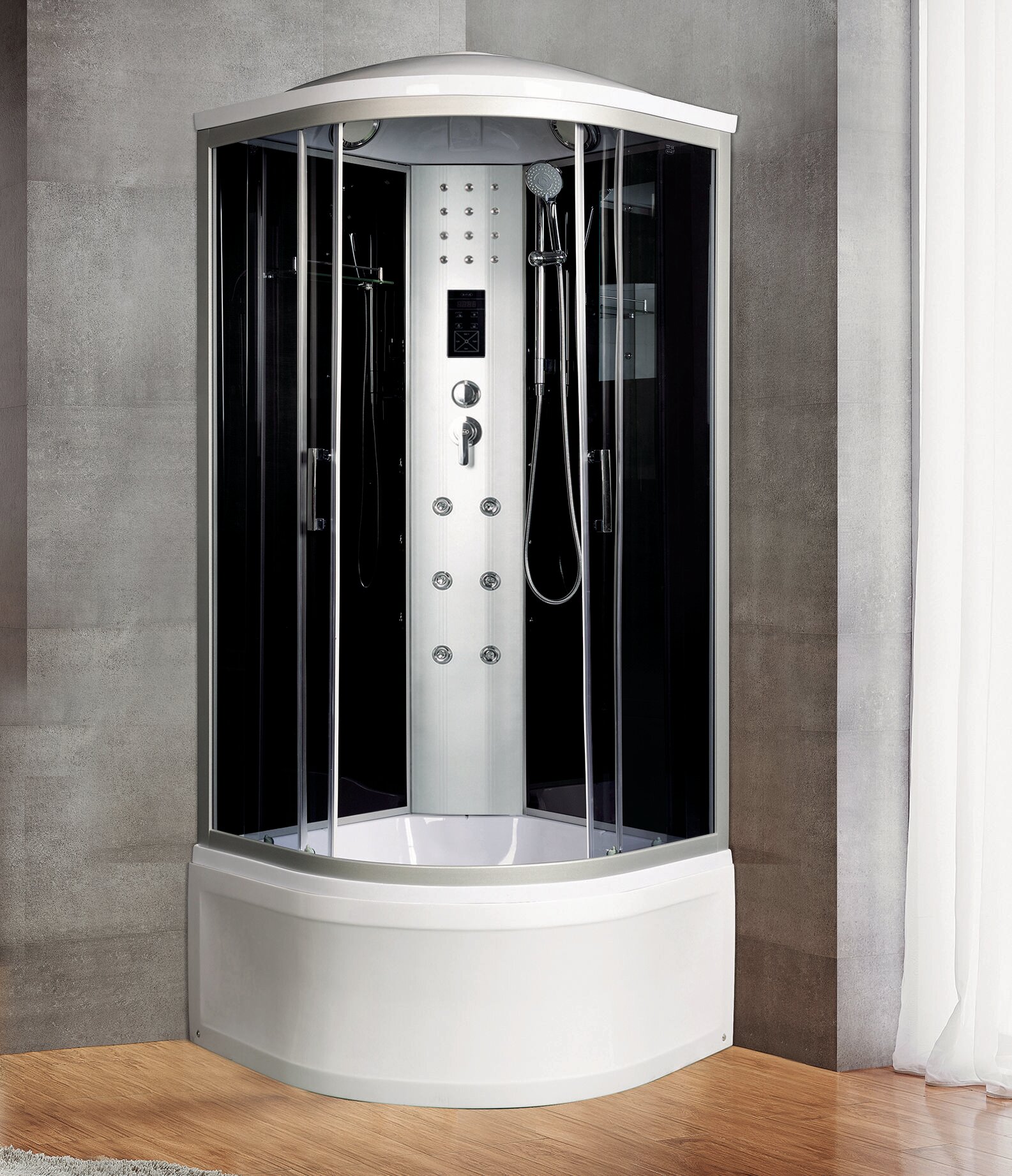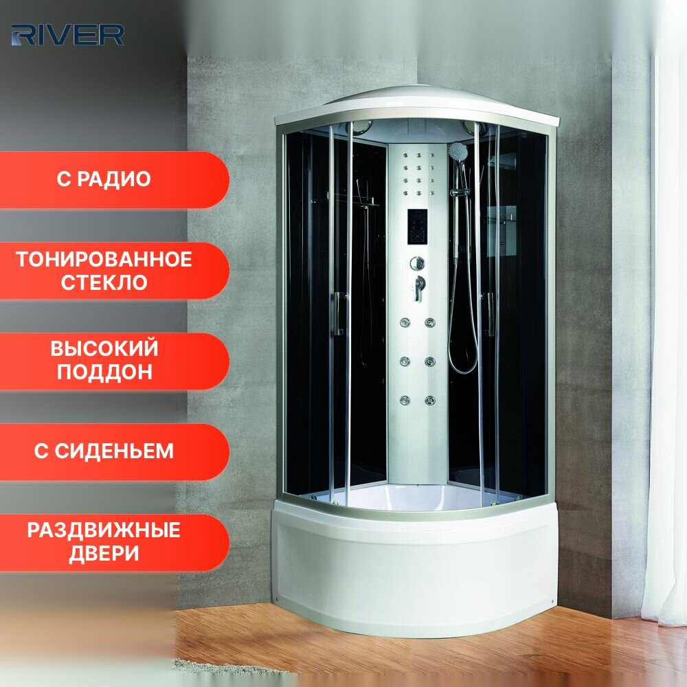 размер: 100x100 cм, четверть круга, поддон: высокий, тонированные, с крышей, верт. массаж 6 форсунок , черный, однопозиционные форсунки, сенсорный пульт, задние стенки: стекло , белый поддон, хром матовый профиля, стойка: хром, высота: 230 см, двери: раздвижные, 4, алюминий, 44 см, 33 см, закрытая, стекло, акрил, на поддон, универсальная, верхний душ, радиоприемник, вентиляция, гидромассаж в кабине, полочка, сиденье, со сборкой без силикона