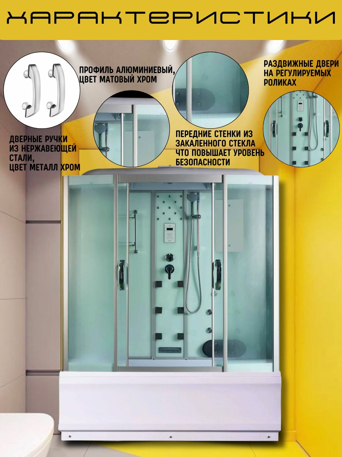 Кабина оснащена многофункциональным дисплеем, который позволяет управлять функциями и настройками. В комплект входят подголовник, сиденье, полки, душевая лейка, зеркало и поддон.
