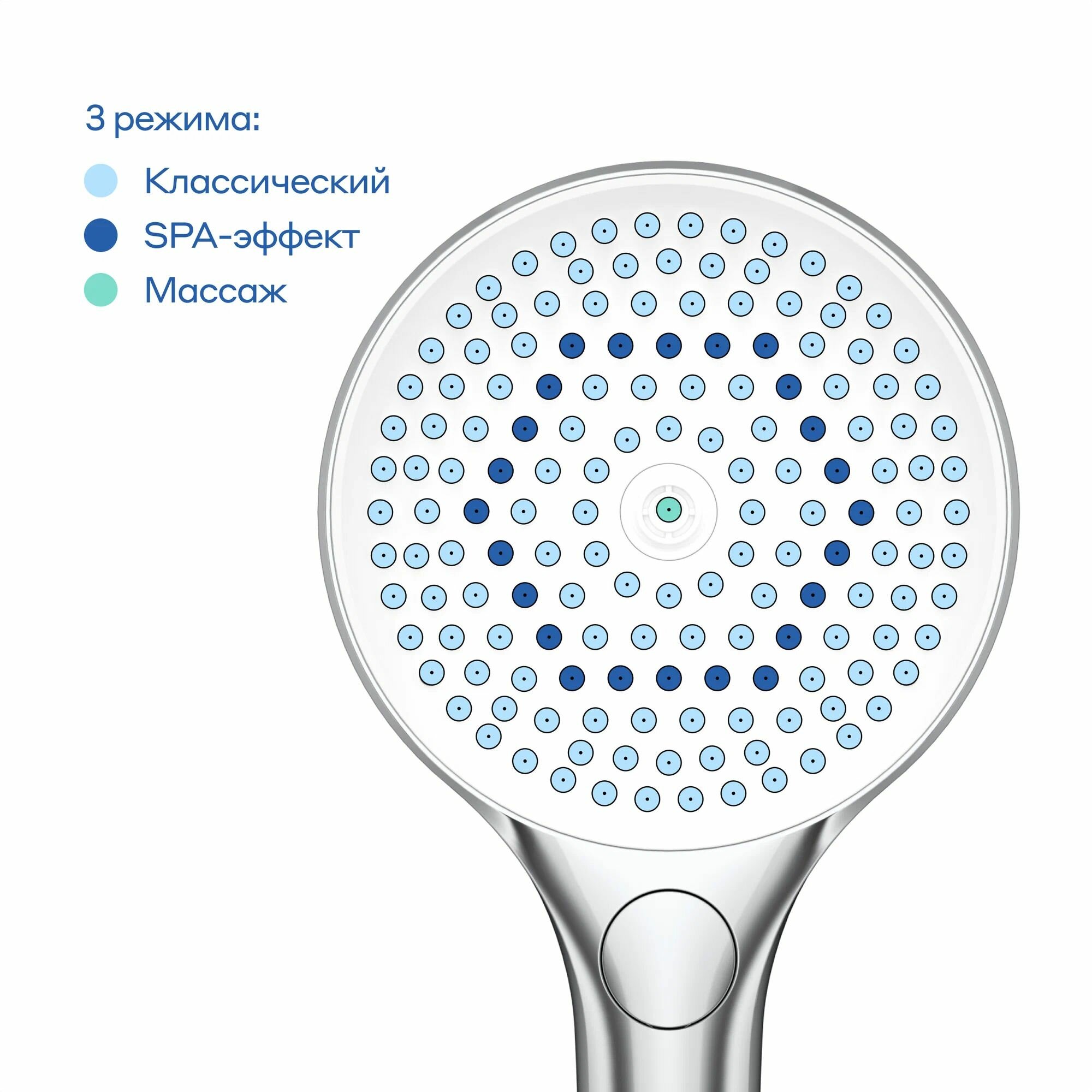В душевой лейке Pragma Nanta есть 3 режима разной интенсивности — классический, массажный и SPA-эффект — которые удобно переключаются кнопкой.