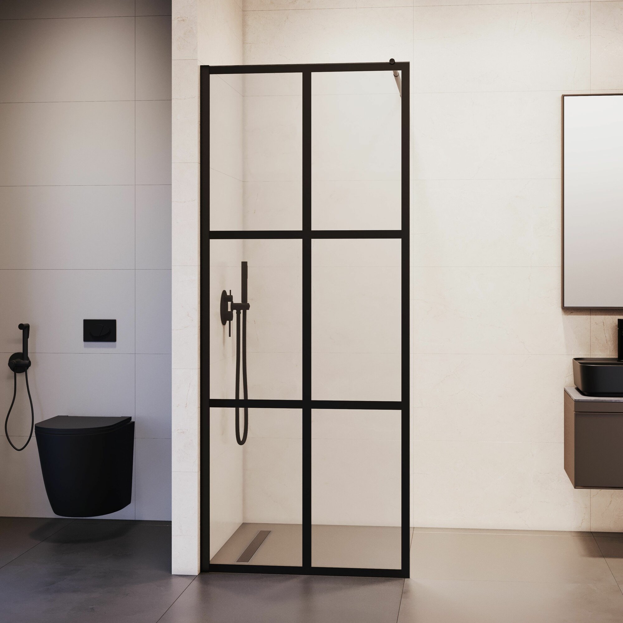 Серия Walk In представлена стеклянными перегородками для отделения душевой зоны от остального помещения ванной комнаты. Ограждения обеспечивают свободный вход в зону принятия душа и не утяжеляют интерьер за счет минималистичного дизайна и отсутствия дверей. Стекла всех изделий имеют покрытие Easy Clean, которое придает им водо- и грязеотталкивающие свойства. Фиксированная душевая перегородка из закаленного стекла с кронштейном 1200 мм в комплекте. Прозрачное стекло имеет принт "решетка", нанесенный методом шелкографии. Модели с размером 700, 800, 900, 1000 - рисунок 6 квадратов. Модели с размером 1200, 1400 - рисунок 9 квадратов. Универсальная установка L/R Ширина: 790-810 мм (регулируемый профиль) Высота: 1950 мм Толщина стекла: 8 мм Цвет стекла: прозрачное + принт Цвет профиля: черный Кронштейн: сталь, телескопический, длина 1200 мм Трап или поддон приобретаются отдельно