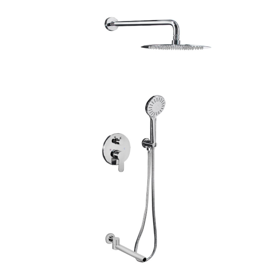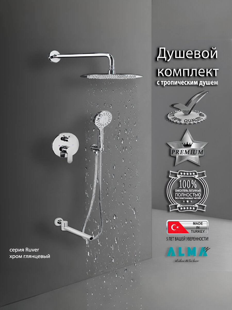 Душевая система (душевой комплект) серии Ruver бренда ALMAes со смесителем и тропическим душем на 3 потребителя, в цвете хром с глянцевым покрытием, имеет минималистичный дизайн и продуманную эргономику. Продуманная конструкция дает гарантию, что сантехника не утратит ни внешней привлекательности, ни своих функциональных качеств даже спустя длительное время. Душ в ванной комнате в определенной степени является обязательным элементом, обеспечивающим полноценные гигиенические условия и достаточное релаксирующее воздействие! Поэтому начнем с верхней лейки которая оборудована тропическим душем! Конструкция душевой системы оснащена тропическим душем диаметром 250 мм. Расположенная над вами верхняя лейка (тропический душ), имитирует ощущение дождя, стекающего на вас, что вы почувствуете, как каждая капля воды спокойно стекает на вас, и сделает вас более расслабленным, когда вы принимаете душ. Вода теплая и мягкая, не оставляющая после себя луж. Верхний душ: выполнен из нержавеющей стали. Ручная лейка: имеет 3 режима струи, выполнена из нержавеющей стали. Держатель ручной лейки: выполнен из латуни. Шланг для душа: выполнен из металлический оплетки, сам шланг отличается неплохой гибкостью, что убережет изделие от перегибов и разрывов, длина 1500 мм. Излив: поворотный, традиционный, длина 250 мм, выполнен из латуни. Встраиваемый смеситель: выполнен из 100% латуни. Смеситель на 3 потребителя. Вверху на смесителе находится вентиль с помощью которого переключаются режимы: верхний душ, ручная лейка, излив. Внизу на смесителе находится рычаг с помощью которого регулируется напор воды и происходит переключение на горячую и холодную воду. Глубина погружения смесителя в стену от 55 до 75 мм. Инструкция в комплекте!
