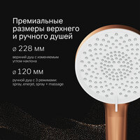 Телескопическая штанга с диапазоном регулировки 400 мм сделает процесс принятия душа удобным для людей любого роста. А благодаря увеличенным размерам тропического (220 мм) и ручного (120 мм) душей вы ощутите все преимущества использования дизайнерского продукта.