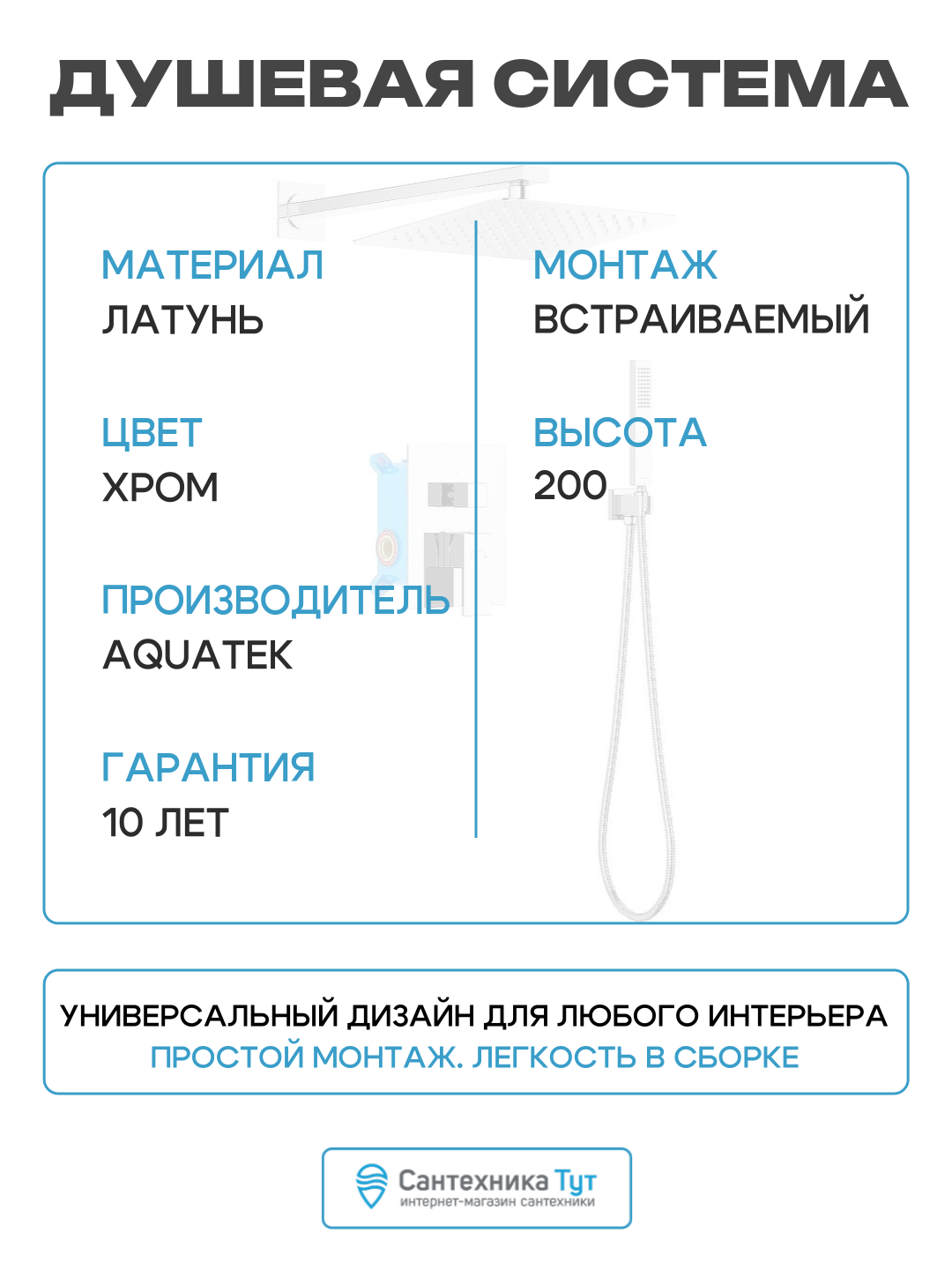антиизвестковое покрытие, аэратор, держатель душевой лейки, защита от обратного потока, защита от скручивания, поворотный излив, регулируемый верхний душ, система быстрого монтажа