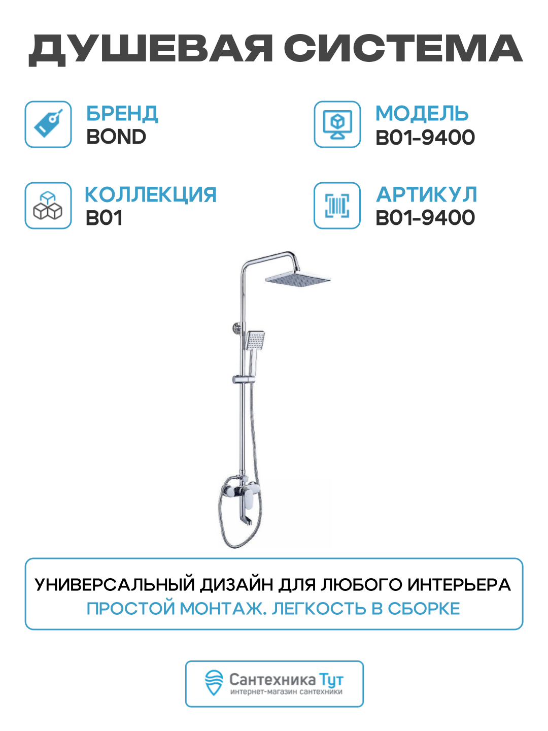 Высококачественная душевая система BOND B01-9400 с тропическим душем и смесителем будет очень круто смотреться в современном интерьере душевой или ванной комнаты. В комплект входят: - смеситель с поворотным изливом, который позволяет с комфортом использовать струю воды по назначению; - керамический переключатель потоков воды; - регулируемая по высоте телескопическая штанга; - регулируемый по углу наклона верхний душ 215х215мм с силиконовыми форсунками, благодаря которым можно очистить их от известкового налёта просто потерев ладонью; - ручной душ 100х95мм с силиконовыми форсунками; - регулируемый по высоте и наклону держатель ручного душа; - шланг 150см повышенной прочности в металлической оплётке.