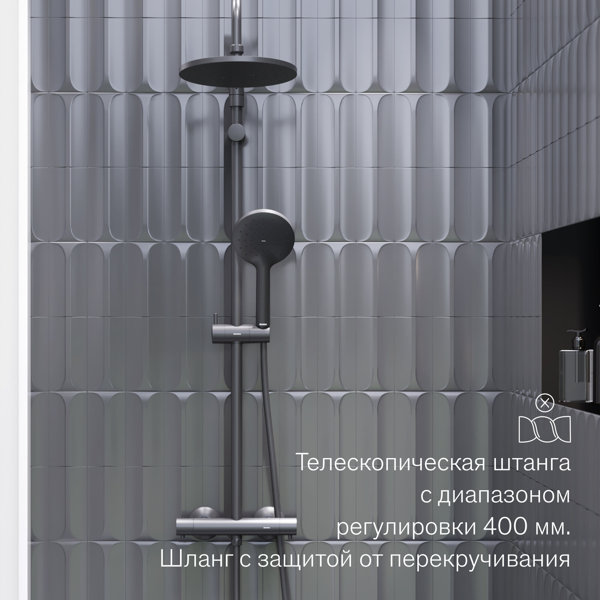Характеристики: Коллекция: Jupiter Типы душевых систем: душевые системы Назначение: для душа Встраиваемая система: нет Тип монтажа: на стену Механизм скрытого монтажа: не предусмотрен Смеситель в комплекте: да Тип управления: термостат Материал корпуса смесителя: латунь Механизм: термостатический картридж Диаметр картриджа: 35 мм Излив для ванны: нет Тип дивертора: поворотный Тропический (верхний) душ: есть Размер верхнего душа: 22.5 см Форма душа: круглая Количество режимов верхнего душа: 1 режим Поворотный верхний душ: да Высота верхнего душа: 105-145 см Регулировка высоты верхнего душа: да С ручным душем: с душем Форма ручного душа: круглая Количество режимов душевой лейки: 1 режим Держатель лейки: регулируемый; поворотный Размер ручного душа: 120 Длина шланга: 150 см Защита от перекручивания шланга: да Количество монтажных отверстий: 3 Поверхность: матовая Цвет: черный Стиль: современный стиль (Hi-Tech); лофт (индустриальный стиль) Гарантия: 120 мес Страна происхождения бренда: Дания Состав поставки: смеситель, штанга, верхний установочный крепеж, эксцентрики, декоративные розетки, верхний душ, ручной душ, держатель ручного душа, шланг, комплект креплений, инструкция Штрих-код: 5708516612476