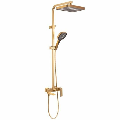 Система включает в себя смеситель, верхний душ, ручной душ, душевую штангу, держатель лейки, настенный держатель, отражатель, переключатель потоков, прокладки, шланг для душа и набор эксцентриков. Все эти элементы выполнены из латуни и покрыты порошковой покраской, что обеспечивает долговечность и привлекательный внешний вид.