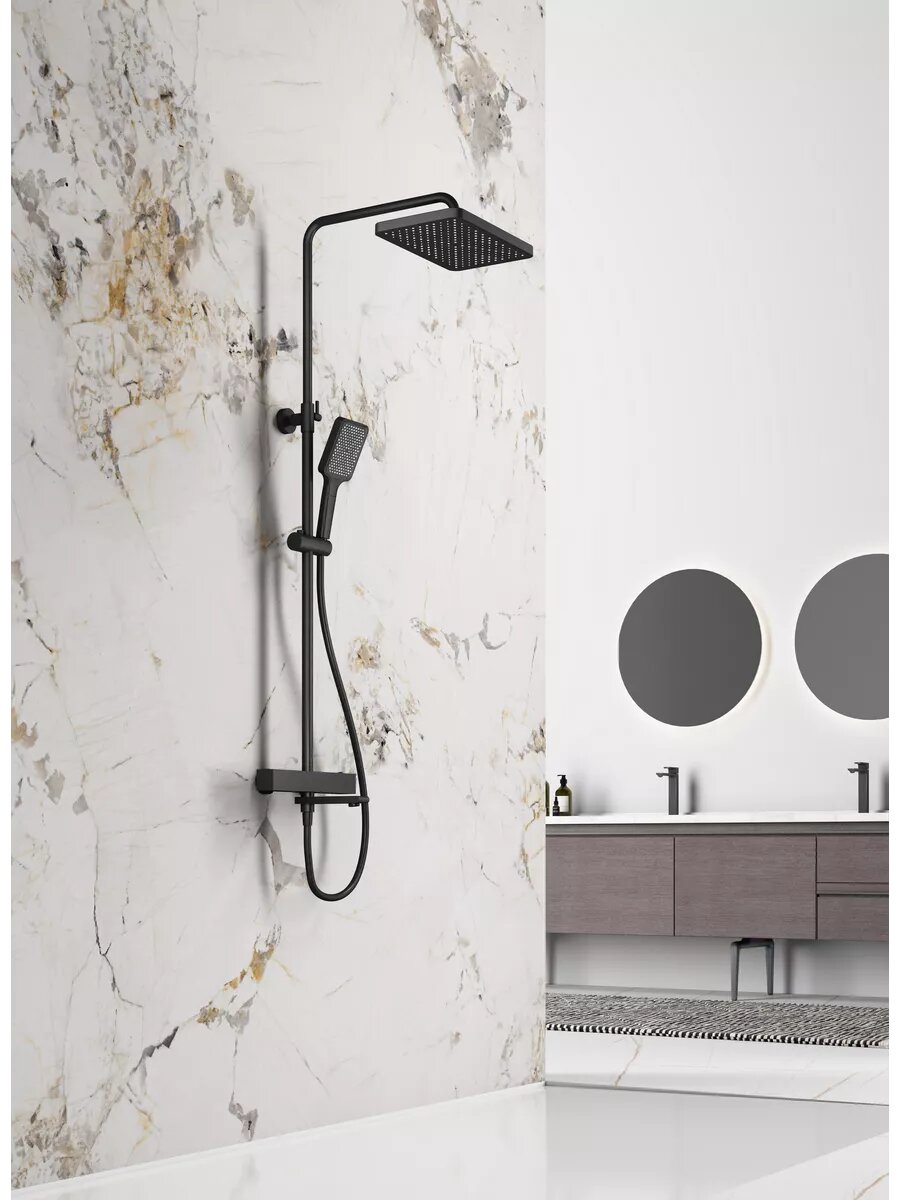 Душевая система с термостатом изготовлена из латуни с хромированной поверхностью. Такой материал отличается прочностью и долговечностью, а также обеспечивает стойкость к коррозии и простоту ухода. Термостатический картридж R502.551 позволяет поддерживать стабильную температуру воды, избегая неприятных ощущений от слишком горячего или холодного душа. Картридж изготовлен из качественных материалов и имеет долгий срок службы. Переключатель с керамическими пластинами (угол поворота - 180°) обеспечивает плавное регулирование потока воды между верхним душем, душевым шлангом и изливом. Керамические пластины устойчивы к износу и не допускают протечек. Излив оснащен переключателем RS01.527, который позволяет выбирать направление потока воды: на излив или в душевой шланг. Аэратор S540.721 обеспечивает равномерную подачу воды без брызг и уменьшает ее расход. Душевой шланг длиной 150 см обеспечивает свободу движений при принятии душа. Душевая лейка имеет 3 режима работы, позволяя выбрать наиболее комфортный для вас. Верхний душ размером 32х21 см создает ощущение тропического ливня, обеспечивая комфорт и расслабление.