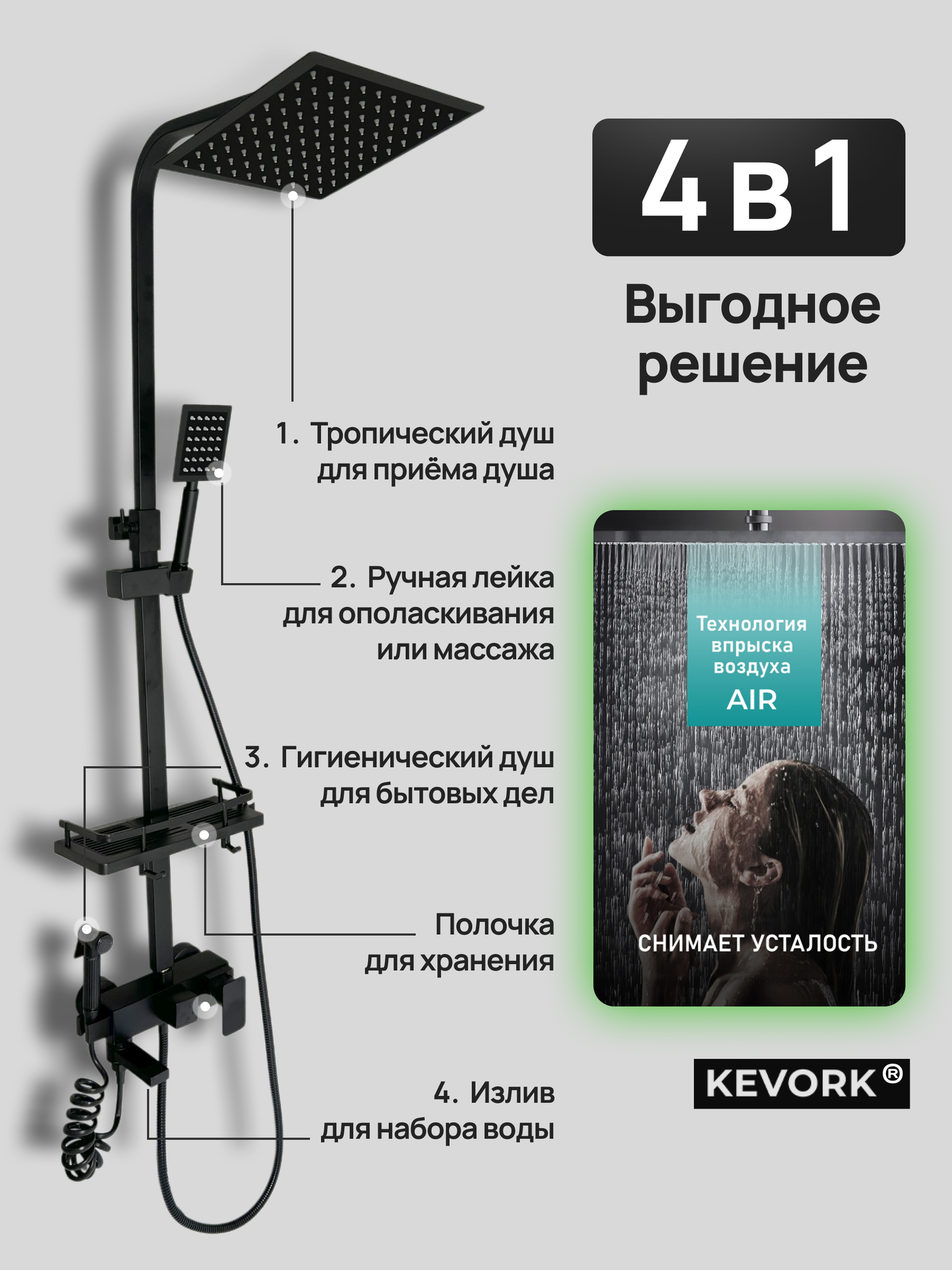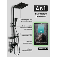 Погрузитесь в мир удовольствия водных процедур с душевой системой Kevork. Этот современный комплект, выполненный в лаконичном черном матовом цвете, станет настоящим украшением вашей ванной комнаты, а также подарит вам незабываемые моменты расслабления. Душевая система включает в себя четыре уникальных типа водных потоков: расслабляющий тропический душ, функциональный гигиенический душ, удобный поворотный кран и стильную ручную лейку.