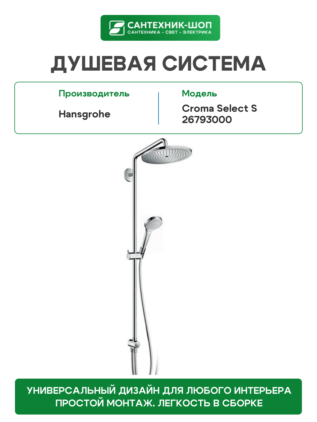 Душевая система Hansgrohe Croma Select S 26793000 Хром латунь на стену: сравнение цен, характеристики, фото, актуальное наличие и цены.