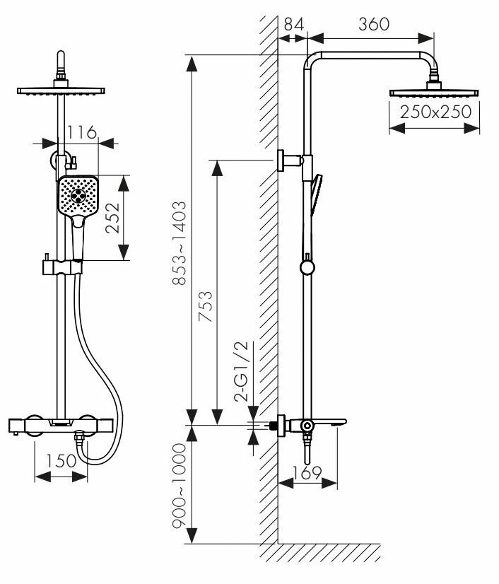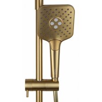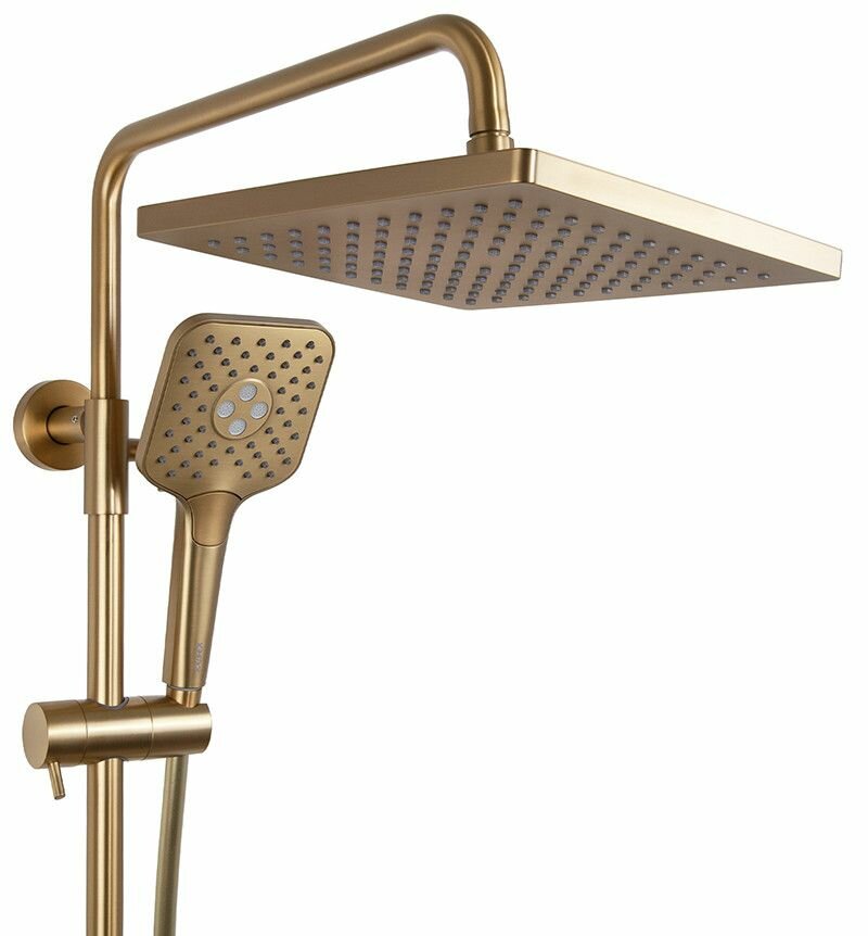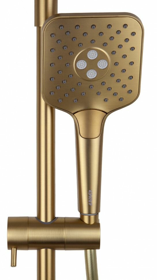 Цвет: шлифованное золото. Материал: латунь. Управление: термостат. Механизм: термостатический картридж. Излив: фиксированный. Стандарт подводки: 1/2. Тип подводки: жесткая. Размер верхнего душа (ШхД): 250х250 мм. Размер ручного душа (ШхВ): 116х252 мм. Количество режимов струи ручного душа: 3. Длина душевого шланга: 1500 мм. Регулируемая душевая штанга: 853-1405 мм. Монтаж: на стену.