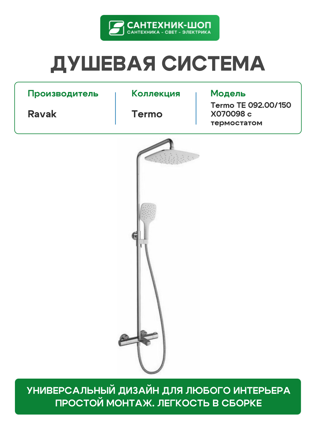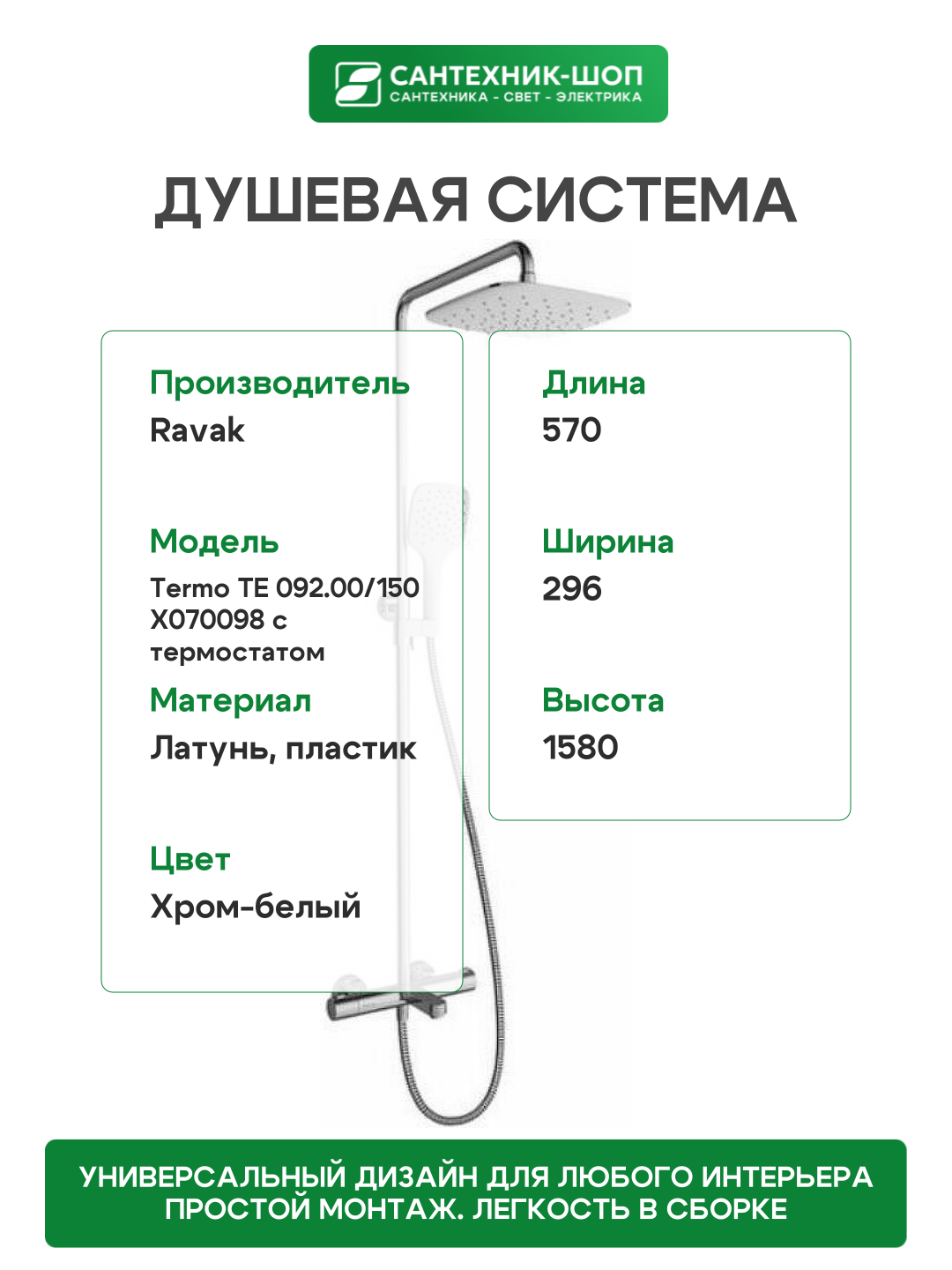 Купить Душевая система Ravak Termo TE 092.00/150 X070098 с термостатом Хром Белый латунь на стену с доставкой по всей России. Душевая система Ravak Termo TE 092.00/150 X070098 с термостатом Хром Белый латунь на стену: сравнение цен, характеристики, фото, актуальное наличие и цены.