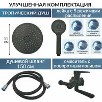 | Комплектация | Душевой комплект: смеситель с поворотным изливом, шланг для душа 150 см, душевая лейка 3 режима, верхний душ Тропический дождь, шланг 50 см для подключения к смесителю, стойка для душа, прокладки, ремкомплект для монтажа с фум лентой. |